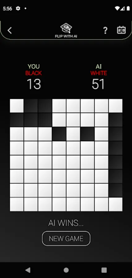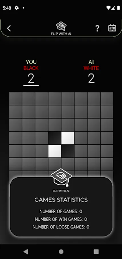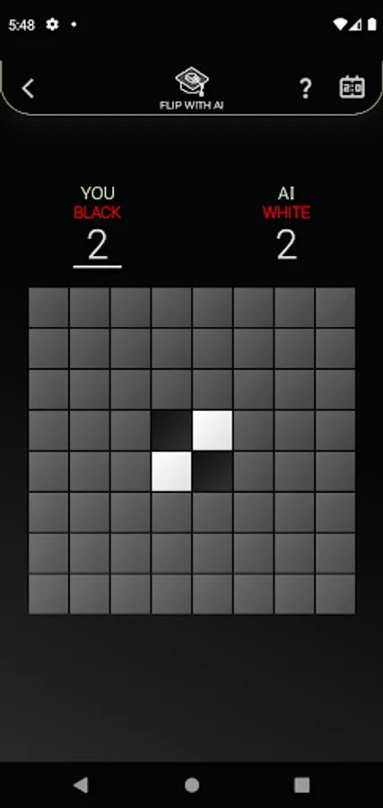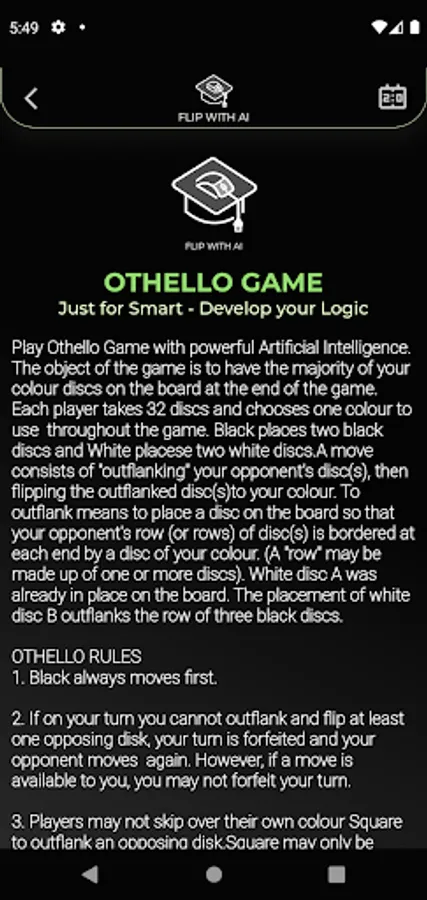 Play Othello Game with powerful Artifical Intelegence. The object of the game is to have the majority of your colour discs on the board at the end of the game. Each player takes 32 discs and chooses one colour to use throughout the game. Black places two black discs and White placese two white discs. A move consists of "outflanking" your opponent's disc(s), then flipping the outflanked disc(s)to your colour.