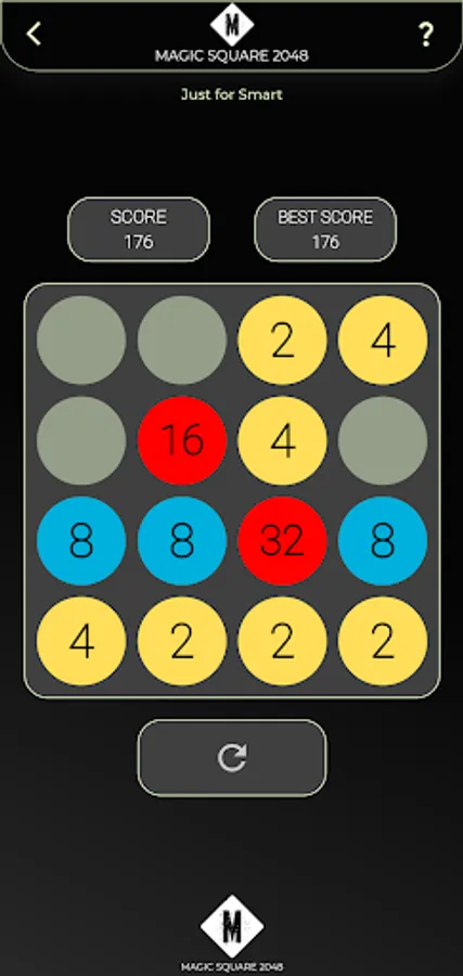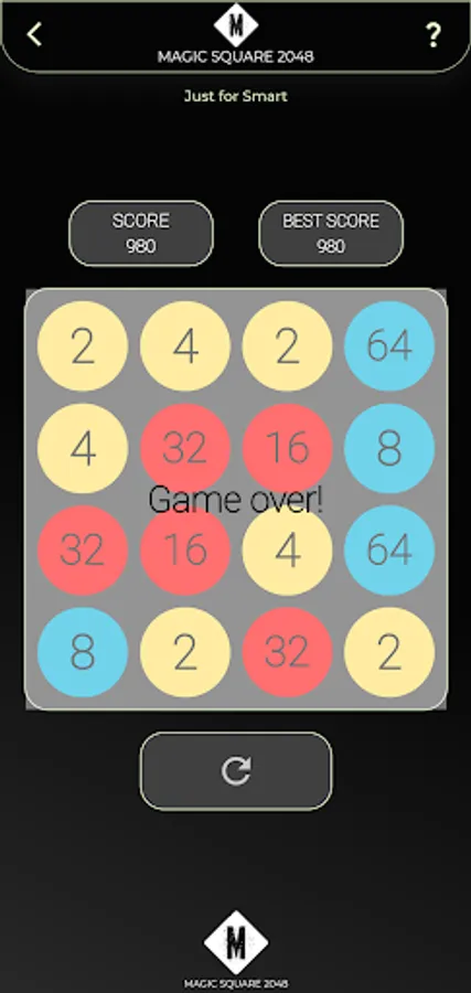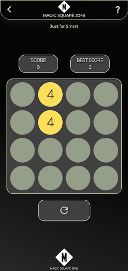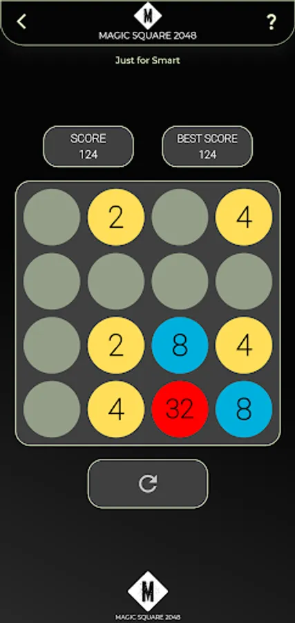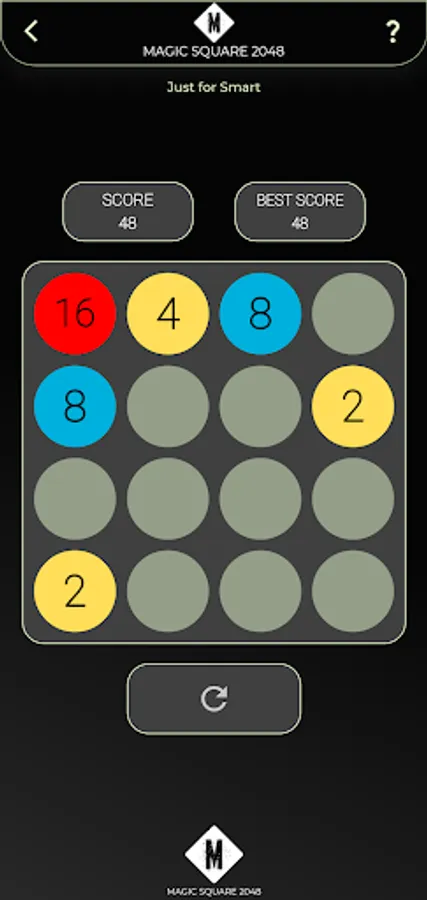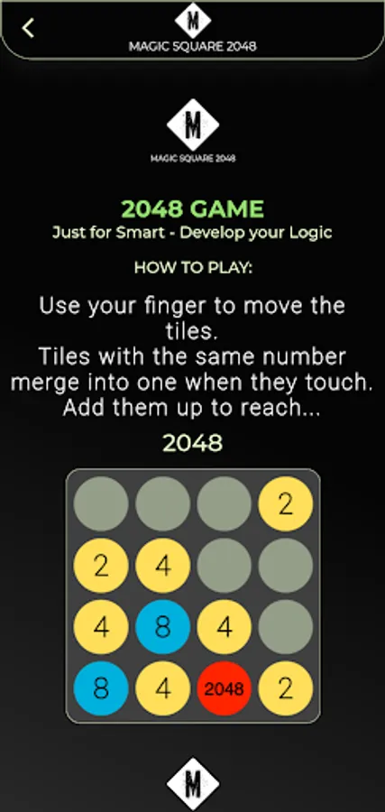 Magic Square 2048 is a single-player sliding tile puzzle game. The objective of the game is to slide numbered tiles on a grid to combine them to create a tile with the number 2048, however, one can continue to play the game after reaching the goal, creating tiles with larger numbers. Strategies in Magic Square 2048 include keeping the highest tiles in a specific corner and to keep that tile in that corner and to fill the specified row with the highest numbers.