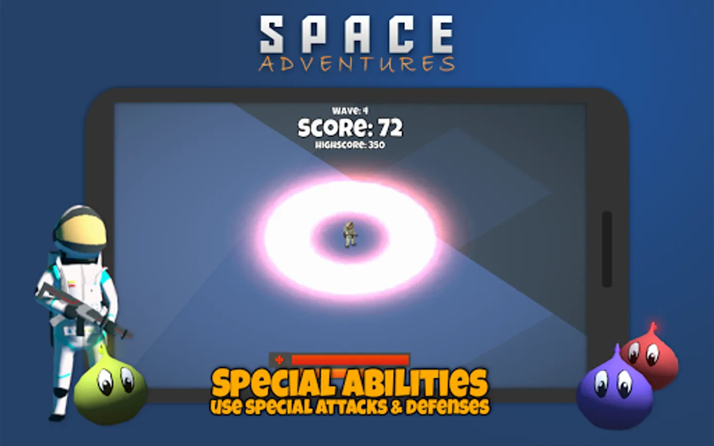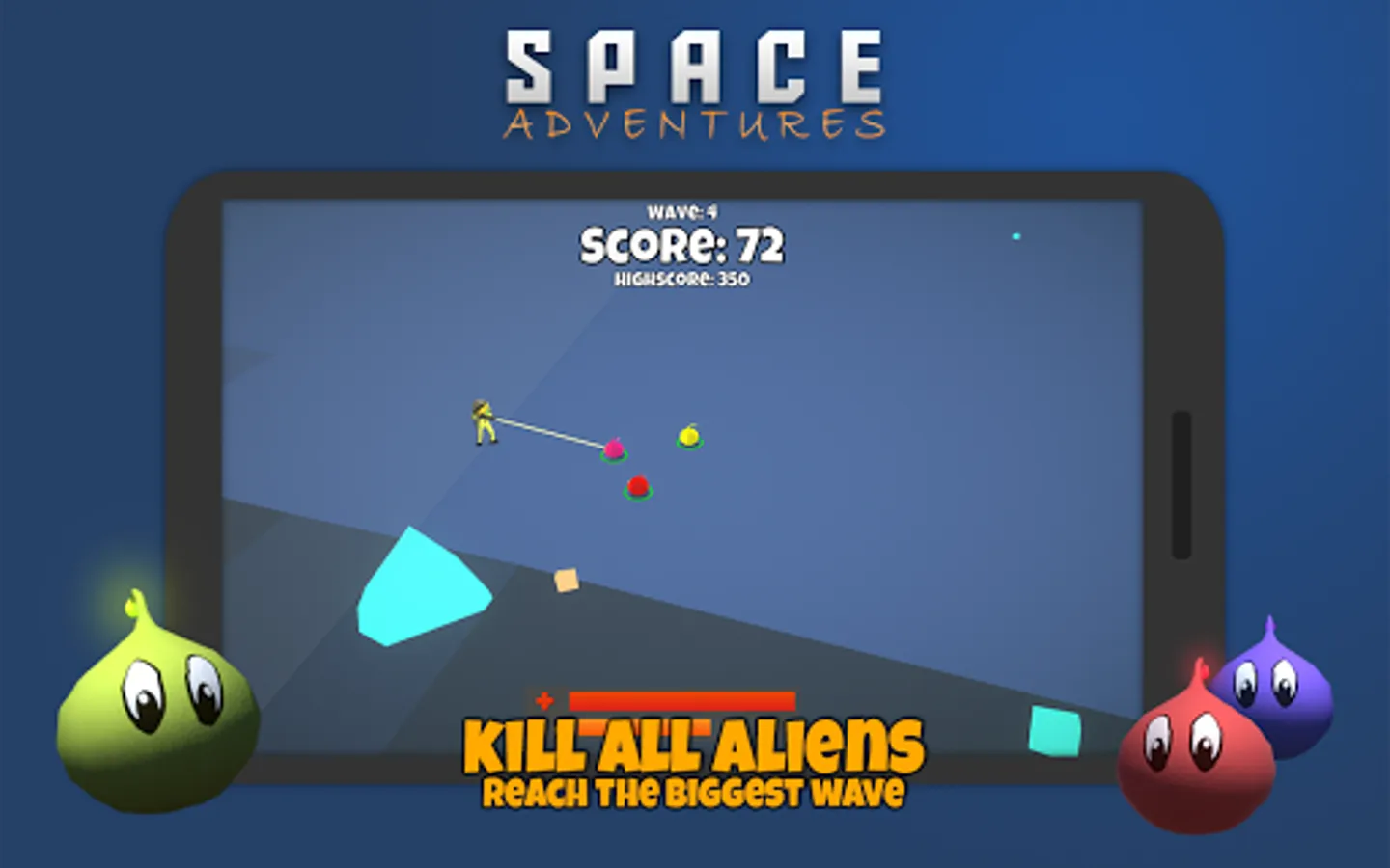 Take a photo to generate playground. Move with a joystick on screen and kill aliens to survive their attacking waves. Pickup health power-ups and collect adrenaline so you could be best on the leaderboard.