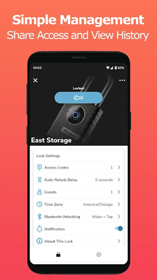 Enjoy speed & ease of use, share access, have greater control with temporary keys/codes, low battery notifications and a 90-day history log. With a Bluetooth Smart-enabled device, you and your guests can unlock & lock your Master Lock Bluetooth Smart-enabled padlock using digital, encrypted “keys”. If you don’t have your phone with you, or you need to share temporary access with someone, the lock can be opened using a code entered on the lock keypad. In default Wake Mode, the lock unlocks upon pressing any button on the lock when your phone is with you. Optional Wake + Tap Mode, adds security by requiring the user to wake the lock and press a button on their phone to unlock the lock. The lock owner can easily add and remove guests and schedule guest access to 24/7 or time-limited access. Disabled Mode allows for maintaining a locked state while the phone is stored inside of a locker. The lock history log captures lock registration; unlock, open and relock activity; unlock method (via Bluetooth Smart-enabled device or directional code); date, time and user (if known); guest invitations, acceptances, access revocations; lock keypad tamper alerts; low battery alerts; Primary Code changes; settings changes (Automatic Relock Time, Unlock Mode, Time Zone); reset keys activity and firmware updates. The lock batteries are replaceable and can be jumped with an external battery if the battery dies in the locked position.