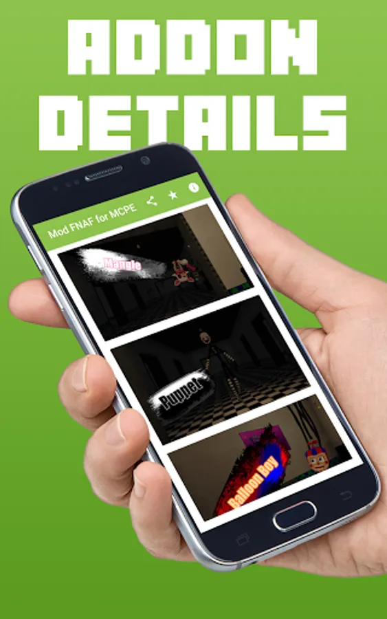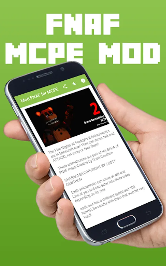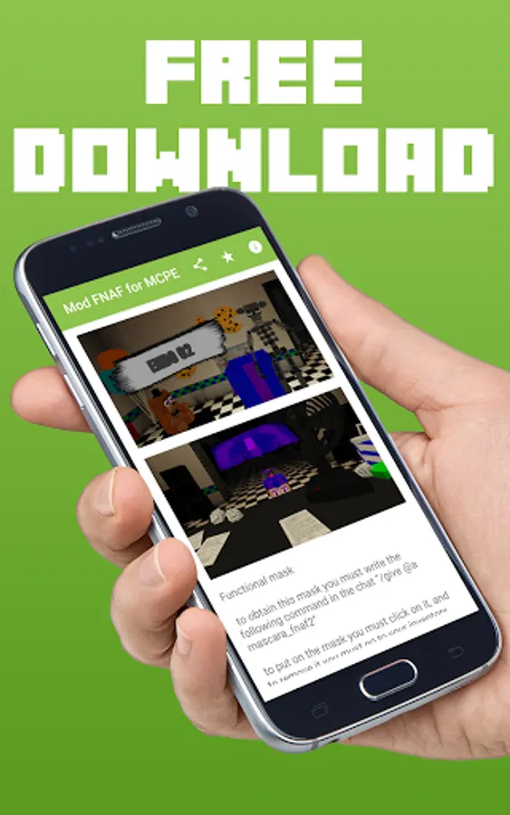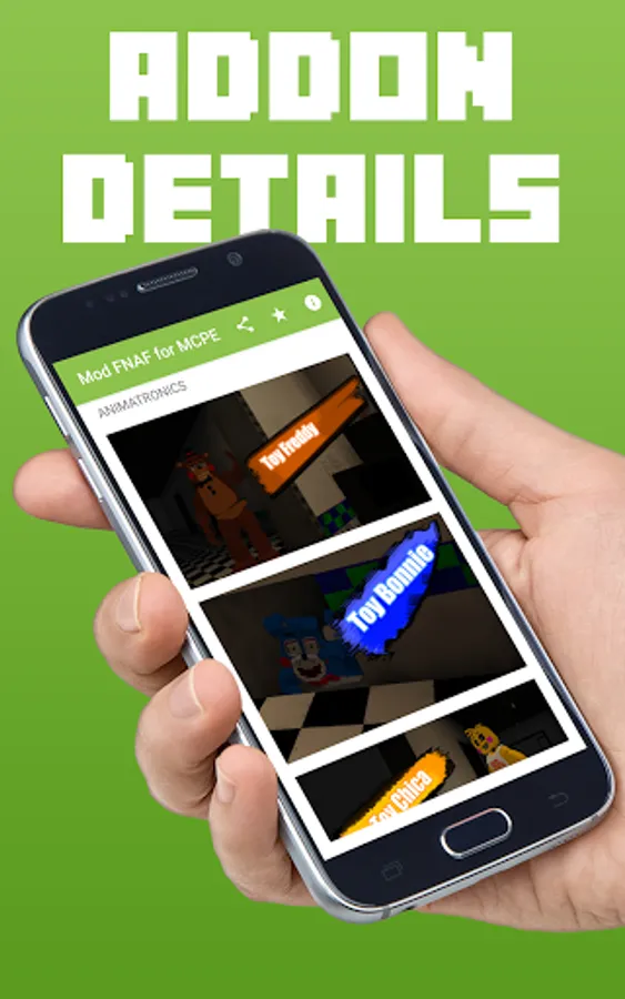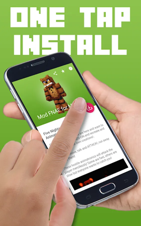Mod FNAF for MCPE is here to help you easily install Five Nights at Freddy's 2 Animatronics Add-on into your Minecraft Pocket Edition! With our 1-Click Install, you'll be able to download and install Five Nights at Freddy's Mod in Minecraft PE game fast and easy in 1 single tap! Save time downloading, more time enjoying with friends and family :)