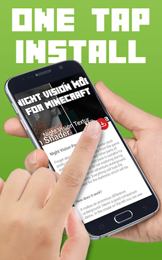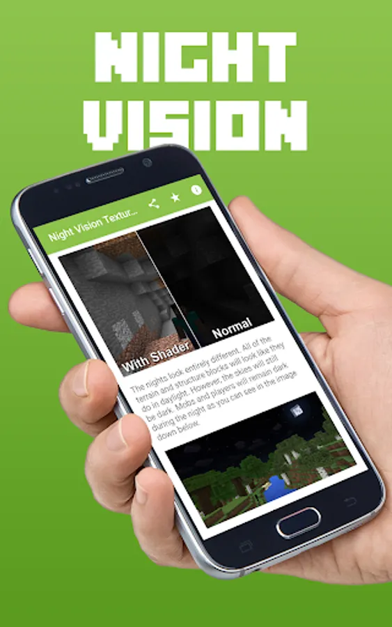 Night Vision Texture Pack for Minecraft PE is here to help you easily install Night Vision Shader Pack into your Minecraft Pocket Edition! With our 1-Click Installation make it easy for you to download and install Night Vision Shader Pack for Minecraft Bedrock game in 1 SINGLE TAP!