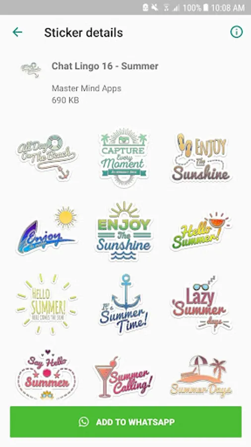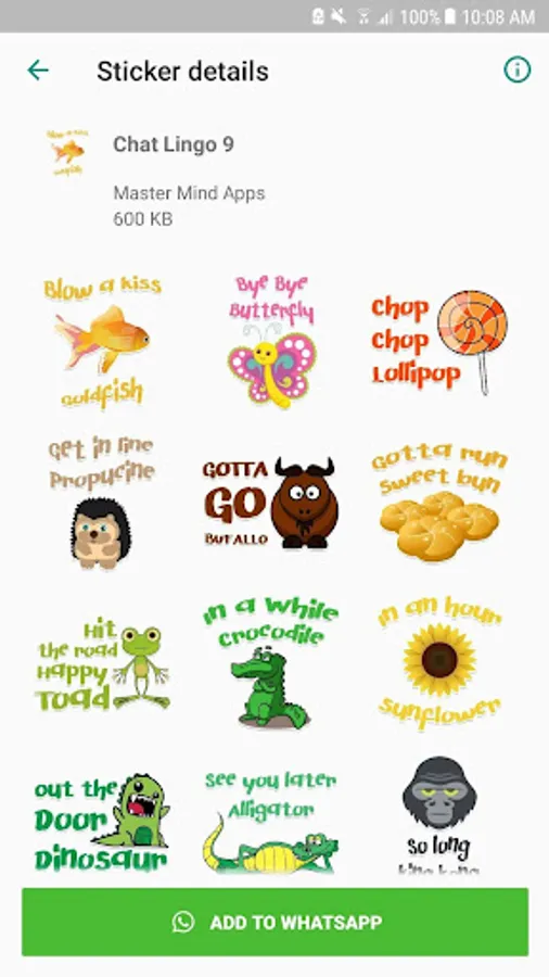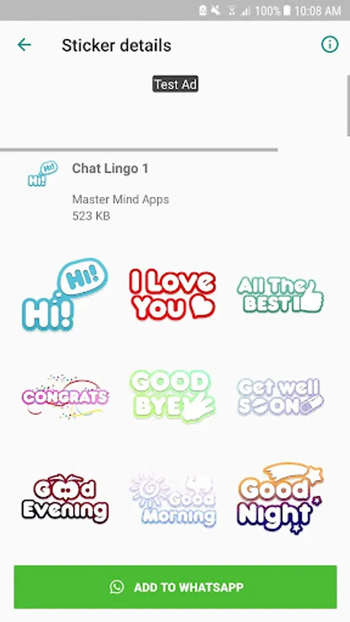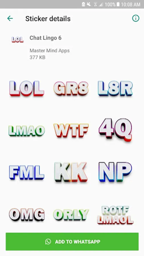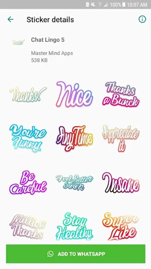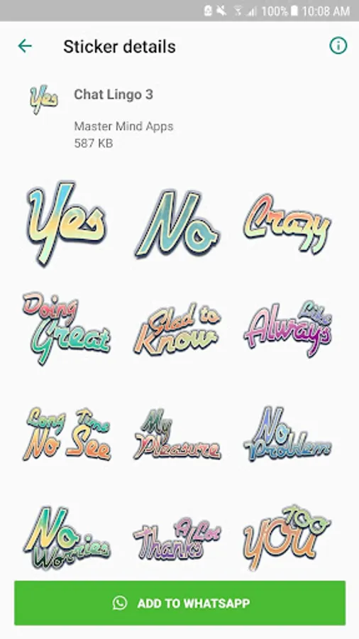 Hi, I love you, Thank you, happy birthday, Good morning, Good evening, good bye, WAStickerApps, hello, sleep well, sweet dreams, welcome, whats'up, amazing, brilliant, okay, no, ok, WAStickerApps, whatsapp, stickers, bye, yes, fine, no problem, pleasure, mon said no, no balance, stuck in traffic, no money, nice, anytime, funny, like, love, babe, kind, LOL, GR8, LMAO, TYT, FYI, IDK, HOT, funny, bored, crazy, scared, awesome, tired, ugly, get well soon, it's a boy, it's a girl, WAStickerApps, happy anniversary, bae, welcome summer, holiday, motivational.