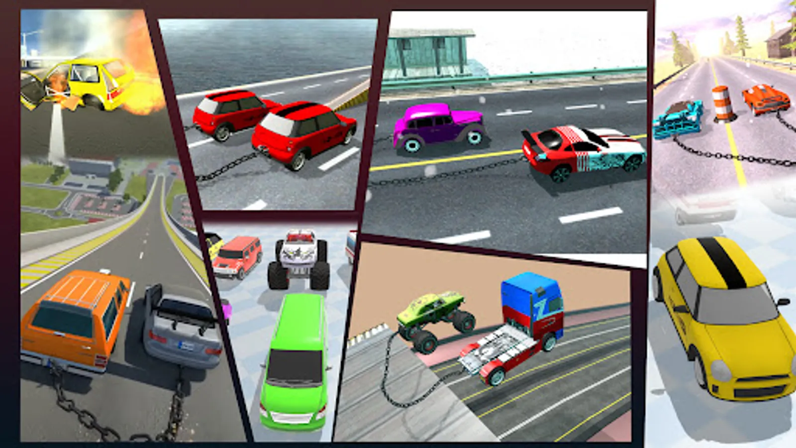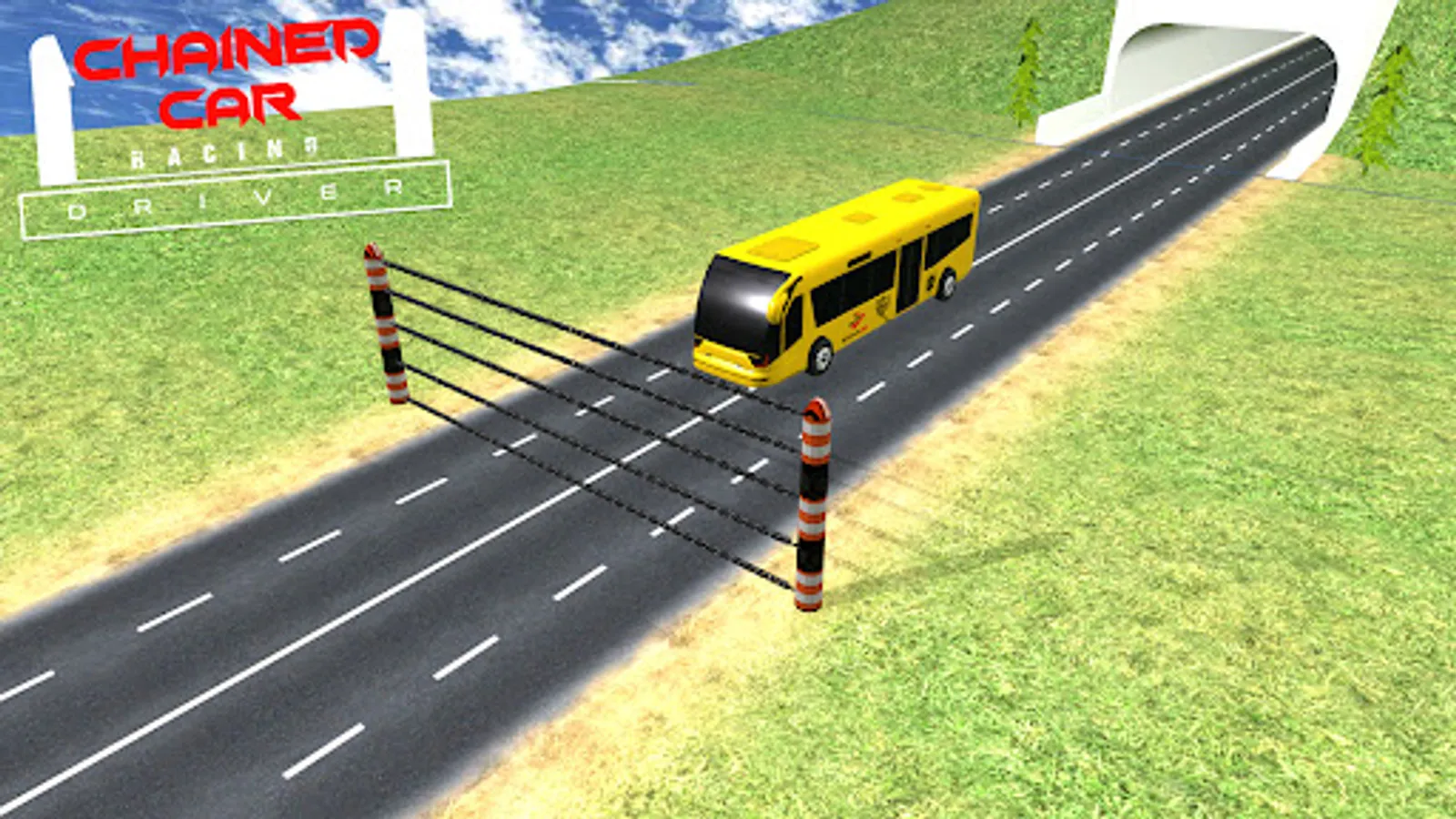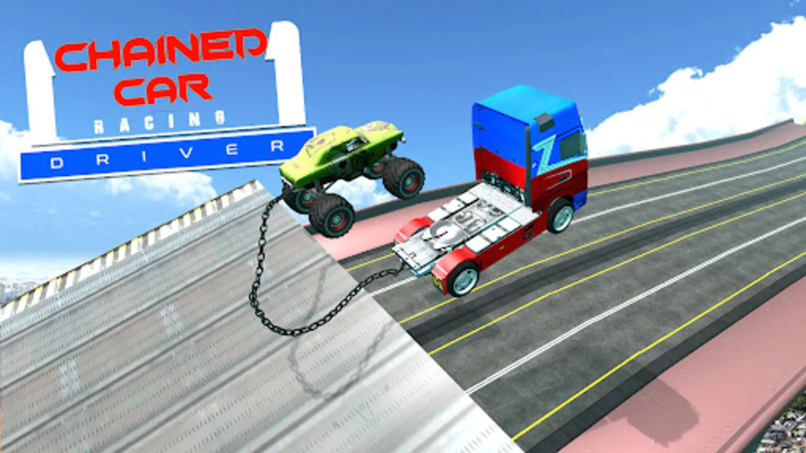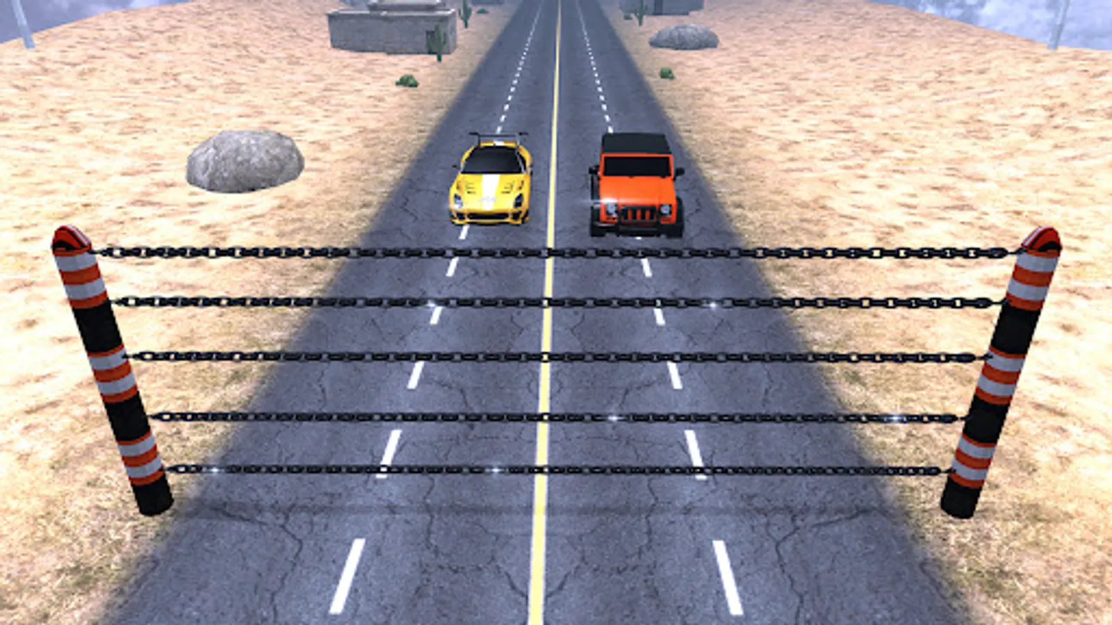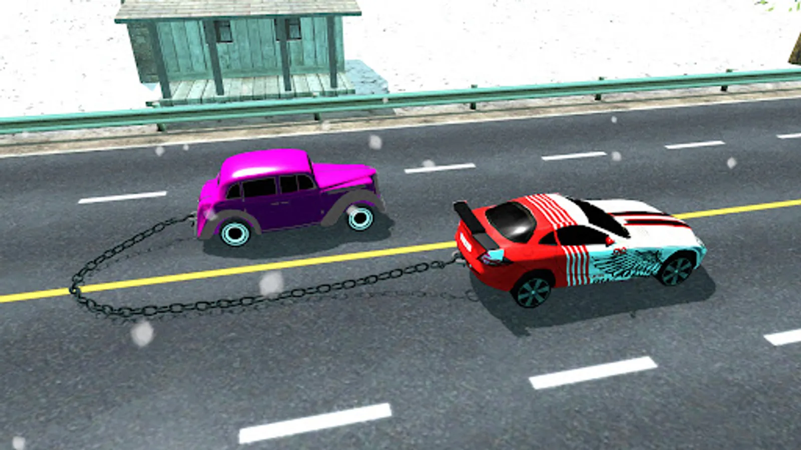 Chains have been attached to you and another car. Drive your car as fast as possible into the oncoming road block so that the opponent car is totaled.