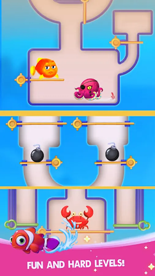 There will also be herrings like pins that don’t need to pull but are moved up or down and bombs, stones, and many others that can disrupt your game playing. The levels may seem easy but you should aim to gain all three stars to reach the next level which is more challenging.