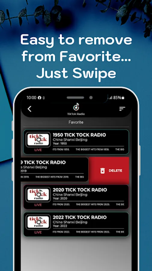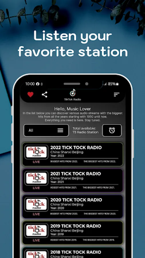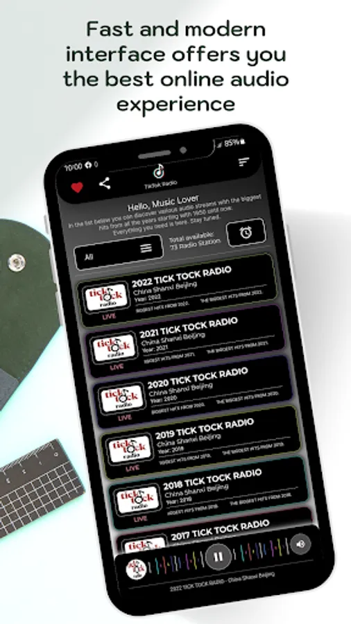 The ergonomics of Radio TickTock has been studied to be the simplest and fastest radio application, thus offering you a fun and easy listening experience đ
