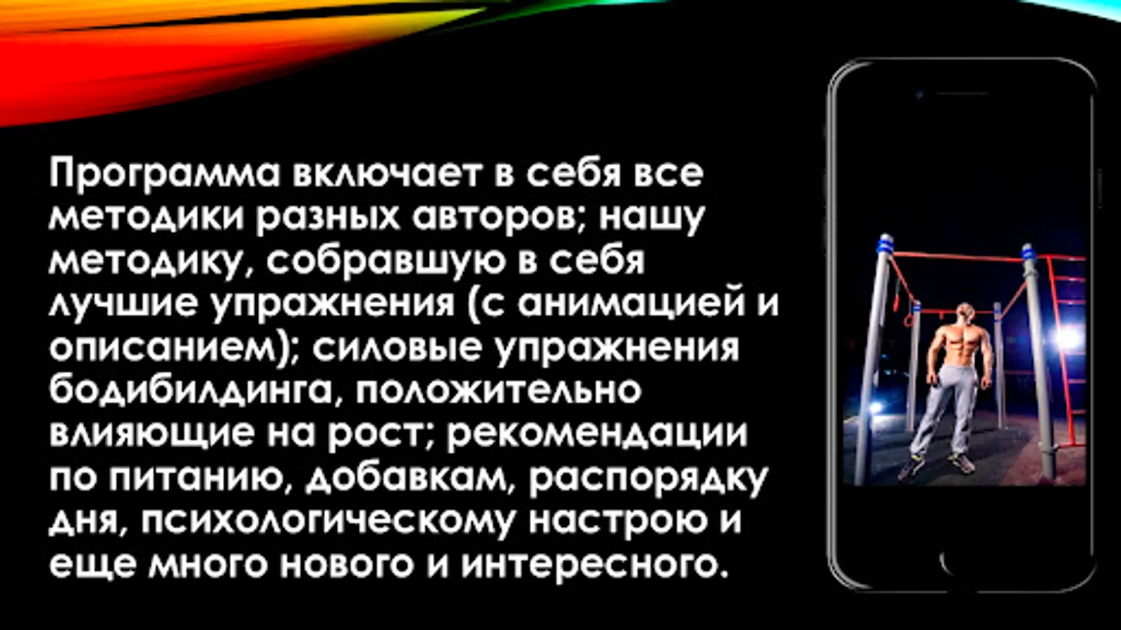 The program includes methods of different authors; our methodology, which has collected the best exercises (with animation and description); strength exercises (bodybuilding exercises) that positively affect growth; the best advice on nutrition, supplements, daily routine, mental attitude, motivation and much more.