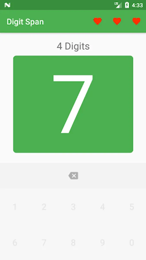 The digit span test is used to measure working memory's number storage capacity. A series of numerical digits will be displayed, after which you'll be prompted to recall the sequence. After each successful attempt, the number of digits is increased by one. After each failed attempt, the number of digits is decreased by one, and a life is lost. After three lives are lost, the highest successful attempt will count as your digit span.