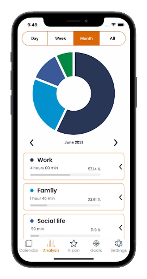 All selections are recorded in the analysis section, you can explore the current day, week, month and all time to see how well you have invested your time. Often, we get carried away doing unimportant tasks, or performing important ones far too long and neglecting other important areas of life like family, self-development and health.