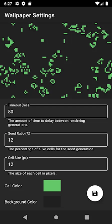 This live wallpaper allows users to set their device home and lock screen as a customized instance of the Game of Life.
