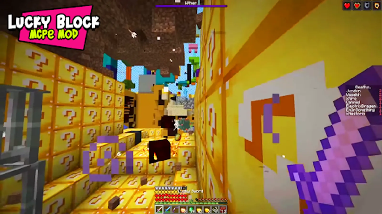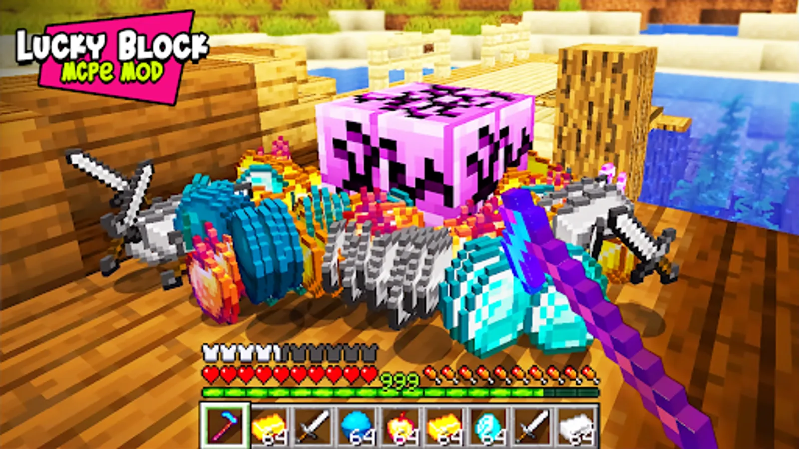 Find best funiest Lucky Block Mod & addon and race map for minecraft MCPE (Minecraft Pocket Edition) This lucky blocks will drop and spawn stuff like items, blocks, mobs or monster structures and give you awesome and scary effects. This also adds, one block survival apart from the lucky blocks minecraft mods, a totally new armor, pixark, new swords, an axe, a pickaxe, new foods, a potion, a new item and a new decoration lucky block.