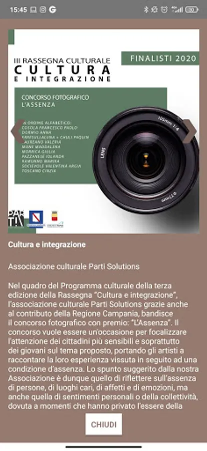The cultural association Parti Solutions, with a great sense of responsibility, has chosen to carry on the "Culture and Integration" review this year too. Economic contingencies make it very difficult to choose to continue investing in the field of art, culture and the enhancement of cultural heritage. Despite these considerations, the association has decided to carry on the cultural initiative, now in its third edition. The photo contest has restarted this year with "The Absence" as its theme.