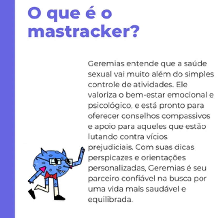 Meet Geremias, the adorable mascot of the Mastracker app! With his engaging personality and valuable knowledge, Geremias is here to help you take care of your health and overcome addictions that may be affecting your life. This revolutionary app is designed to track your sexual activities and provide you with valuable insights into your overall well-being.