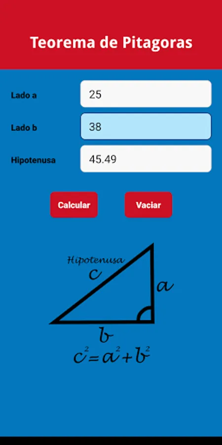 Find the unknown area of a right triangle quickly. This application was designed in order to provide an easy way to obtain the unknown area of a right triangle since many times students or people who need to solve these types of problems in daily life find it tedious to carry out these calculations manually. All this has ended since with this application you will have the solution to these problems in the palm of your hand.