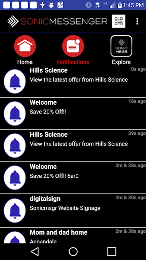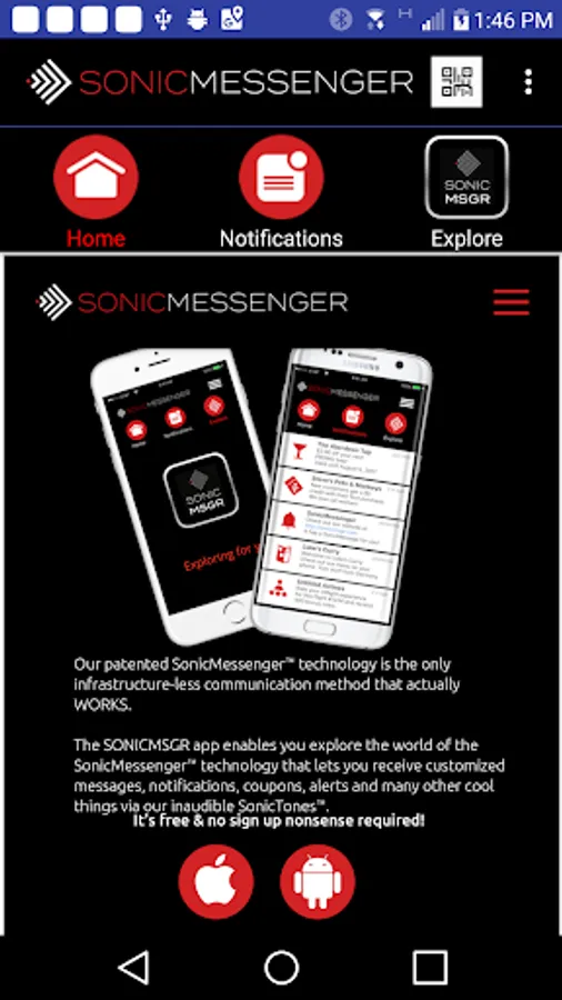 SonicMessengerTM uses a patented ultrasound communication technology that emits encoded text messages into inaudible acoustical tones and decodes the incoming sonic tone back into a custom text messages, coupons, links to websites or videos and much more.