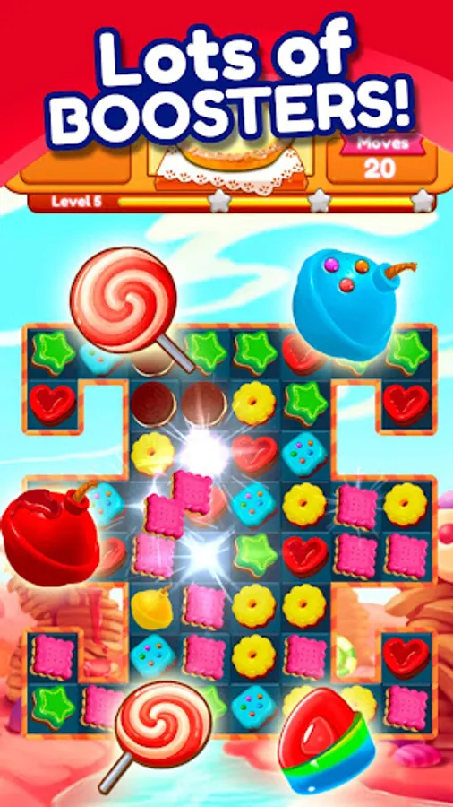 * Sweet supply of power-ups and boosters that will help you pass blast through the challenges and reach the level target.