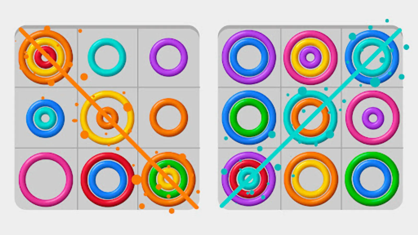 ▶ Once you fill in each block with same-colored rings in a vertical, horizontal, or diagonal line, the rings will be matched and will disappear, then the block will be freed up for new rings.