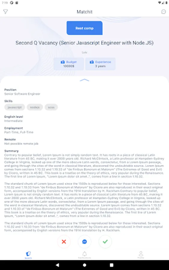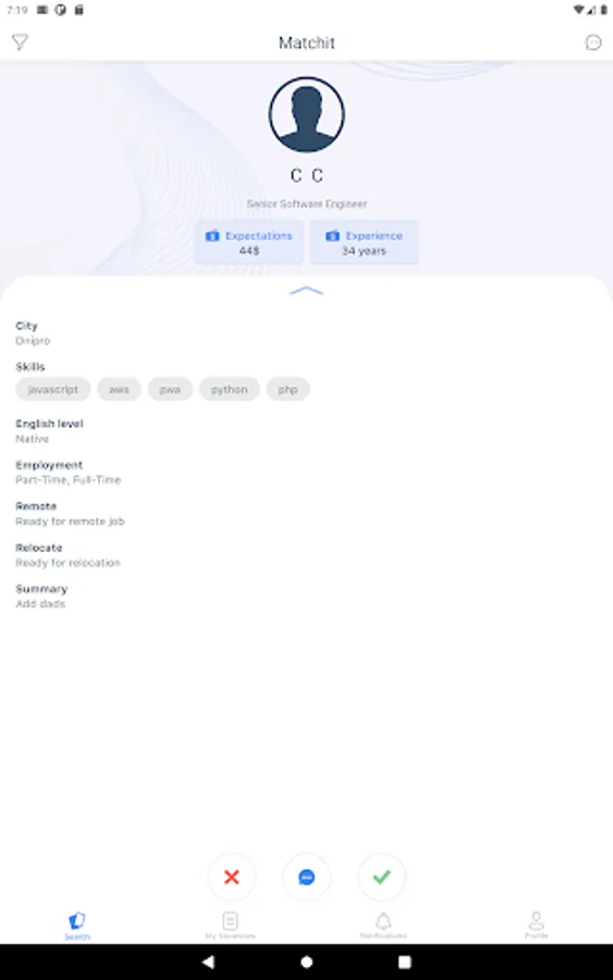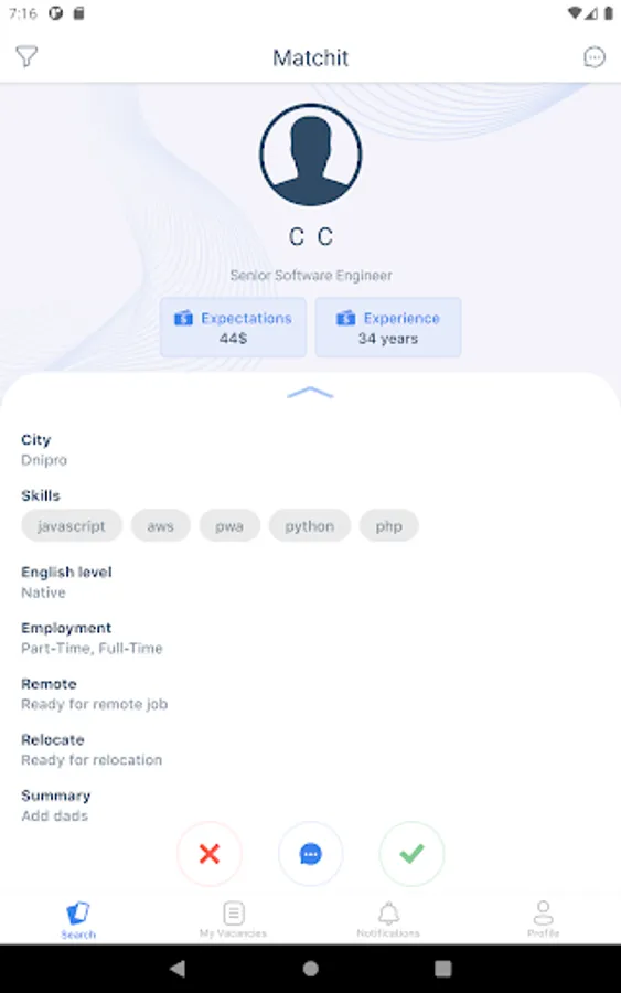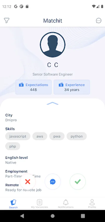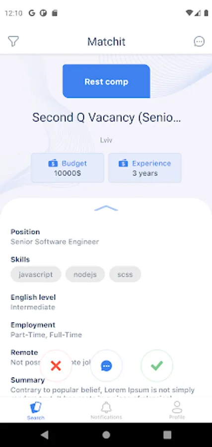 Додаток Matchit розроблений з використанням механіки популярних Dating-apps, але з зовсім іншим призначенням. Тут рекрутери публікують вакансії, а кандидати заповнюють коротку інформацію про себе та свій досвід. Далі вся справа за алгоритмами пошуку співпадінь між даними кандидатів та вакансій.
