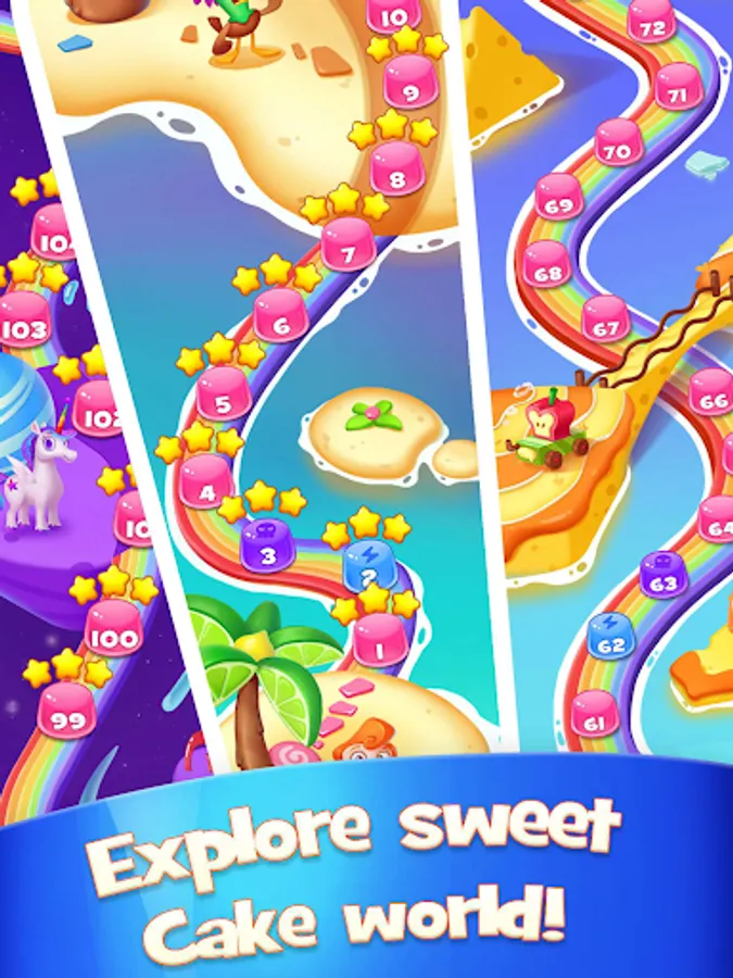 - Tasty and yummy cake and delicious dessert set with cake jam, gummy and cookie smash in each level.
