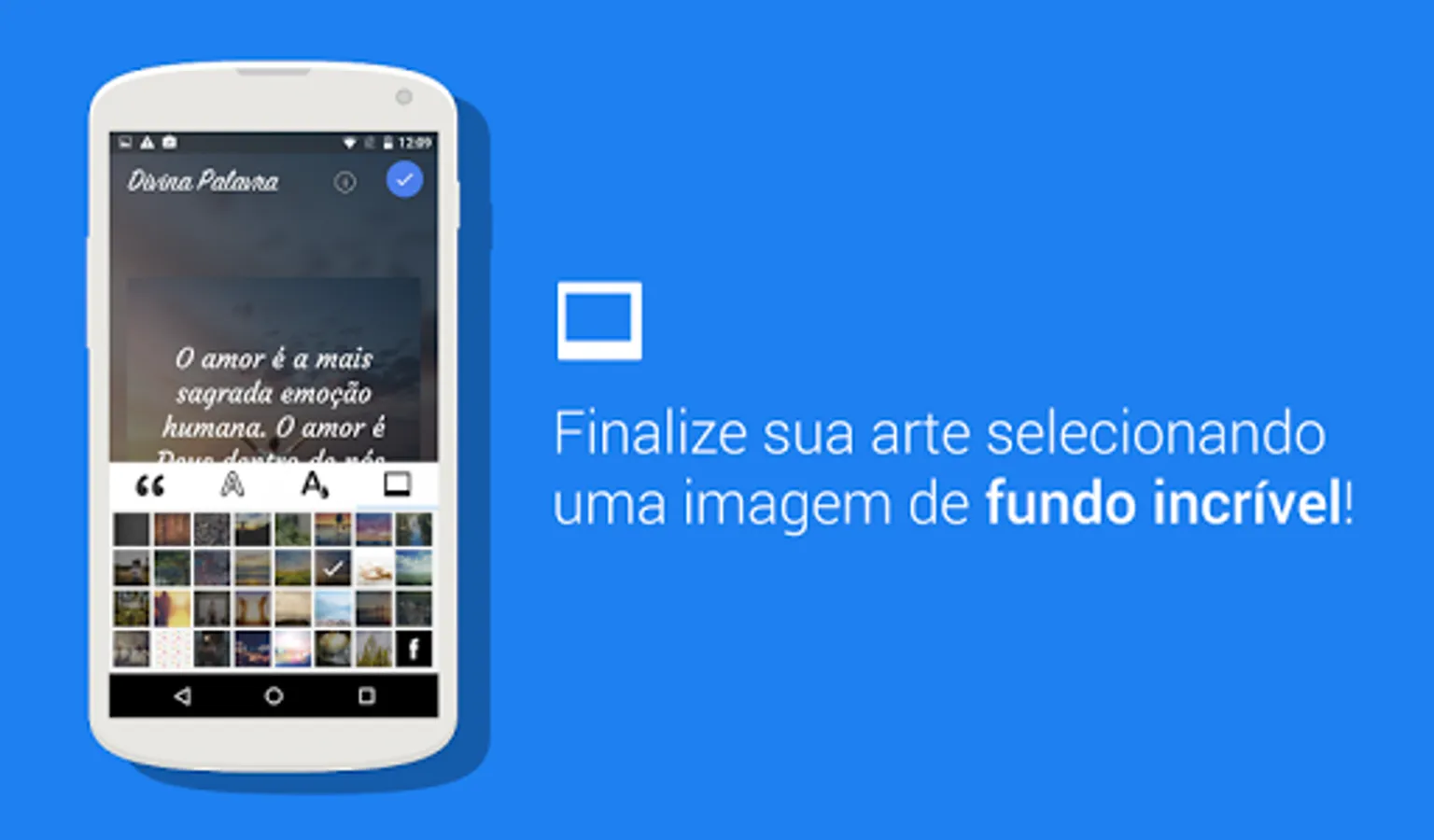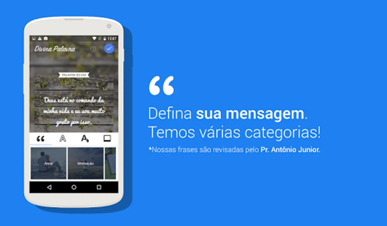 The Divine Word app is for evangelical men and women who want to create, edit and share thoughts, emotions, faith and Bible phrases along with photos and images you want. You can use photos from your mobile phone, facebook and still use beautiful images provided by our app.