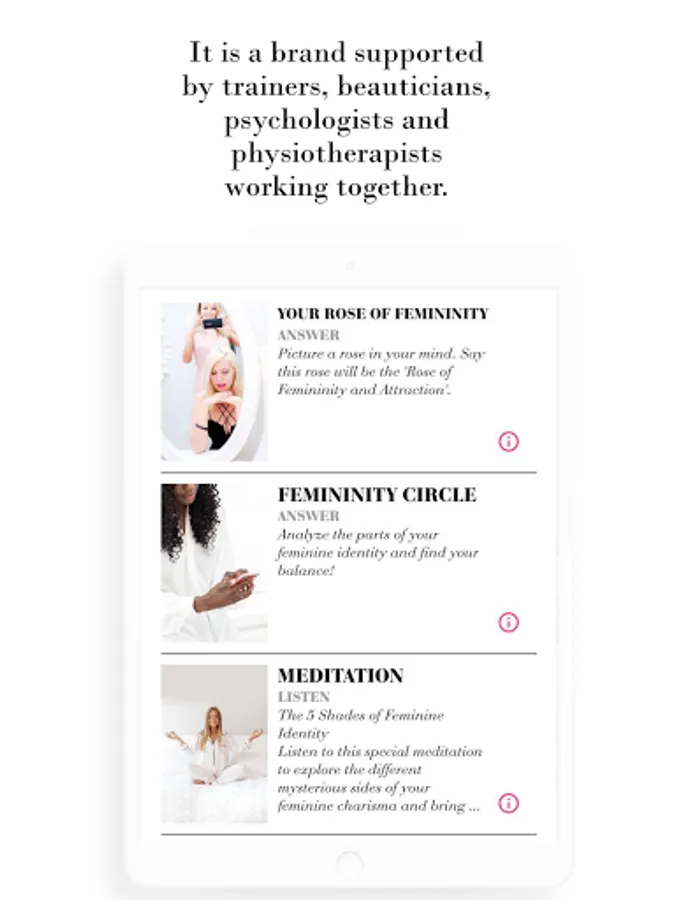 MIND: Beauty, Charisma and Self-confidence go hand in hand. This is exactly why we co-operate with psychologists and life coaches. In this part of the routine you can find several femininity and self–esteem exercises, meditations, audios along with a technique based on a special meditation called Meditattractiveness which targets the growth of your personal magnetism.