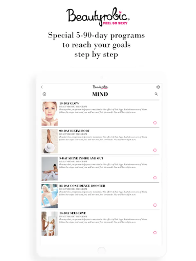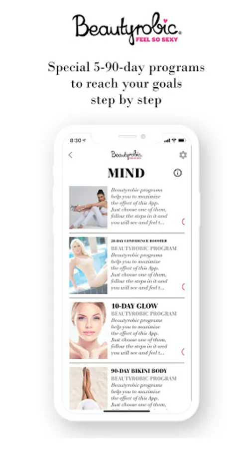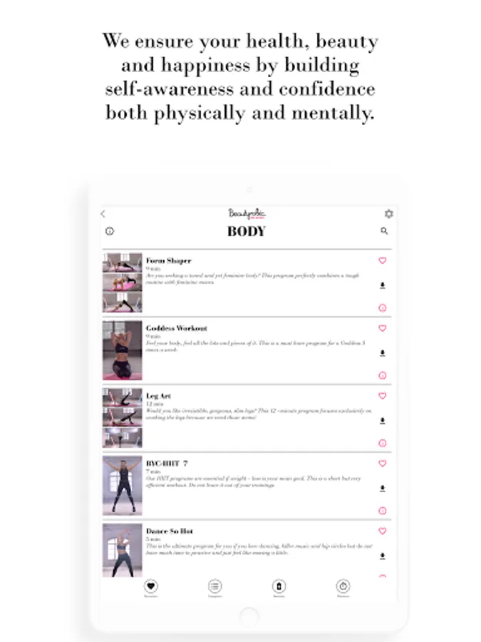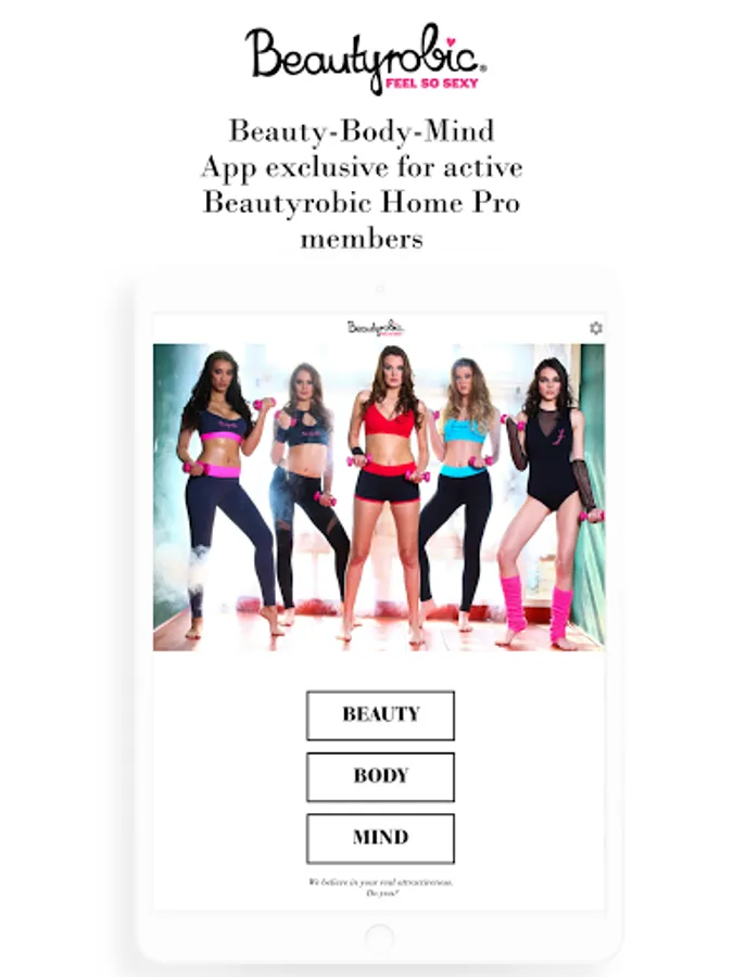 Beautyrobic® is the first Beauty-Body-Mind Training in the world. We do not solely emphasize on the body shaping effect but on your external and internal glow as well. It is a brand supported by trainers, beauticians, psychologists and physiotherapists working together for one mutual goal: turning you into a happy, attractive, well – balanced, and irresistible version of yourself. This app helps you achieve that.