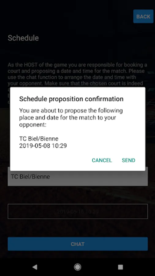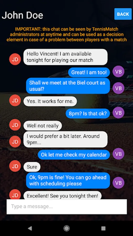 TennisMatch allows tennis players to get in touch and schedule their matches. The app provides a mechanism to ease the process of scheduling, enforcing the presence on the court and setting scores. Everything is synchronized with a server where tournament organizers can deploy and maintain their tournaments.