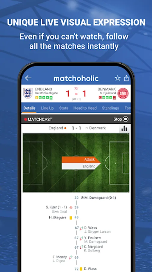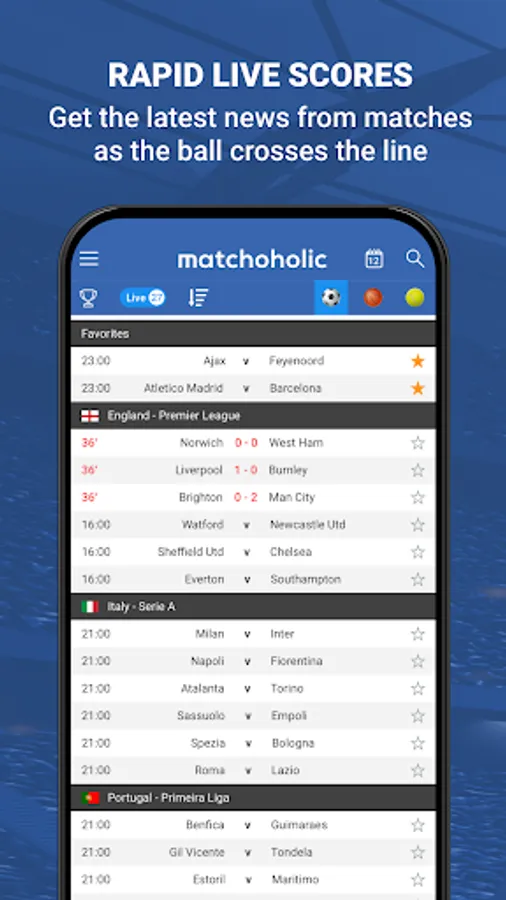 The fastest goal notifications, live results, detailed statistics, in-depth team comparisons and player profiles are in your mobile with Matchoholic.