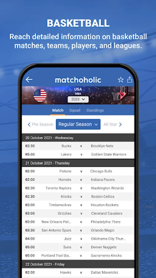 With Matchoholic, you can get live basketball scores just as fast as in football! Follow all the details in basketball games with our user-friendly interface. See the latest performances and forms of teams and players in-depth.