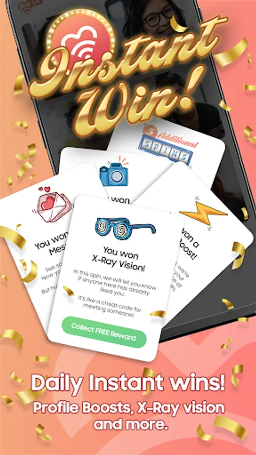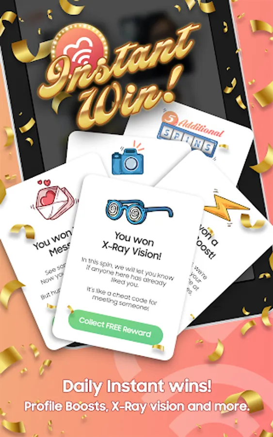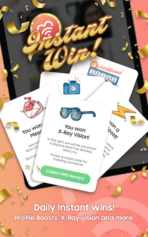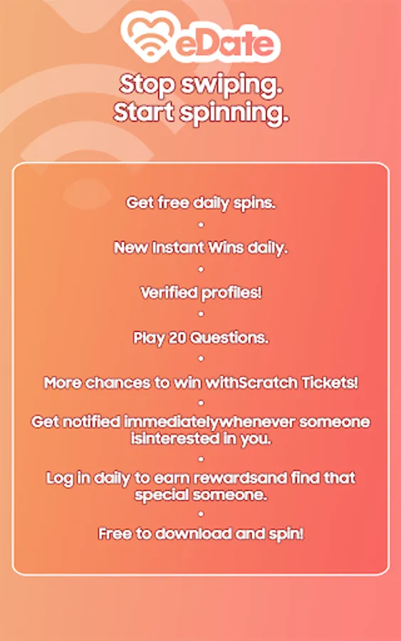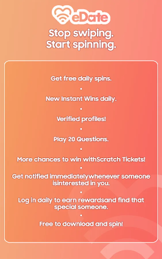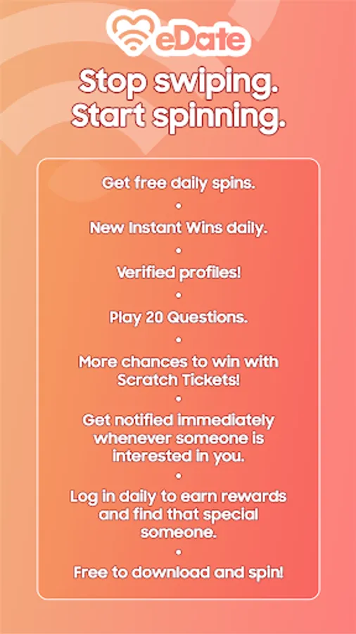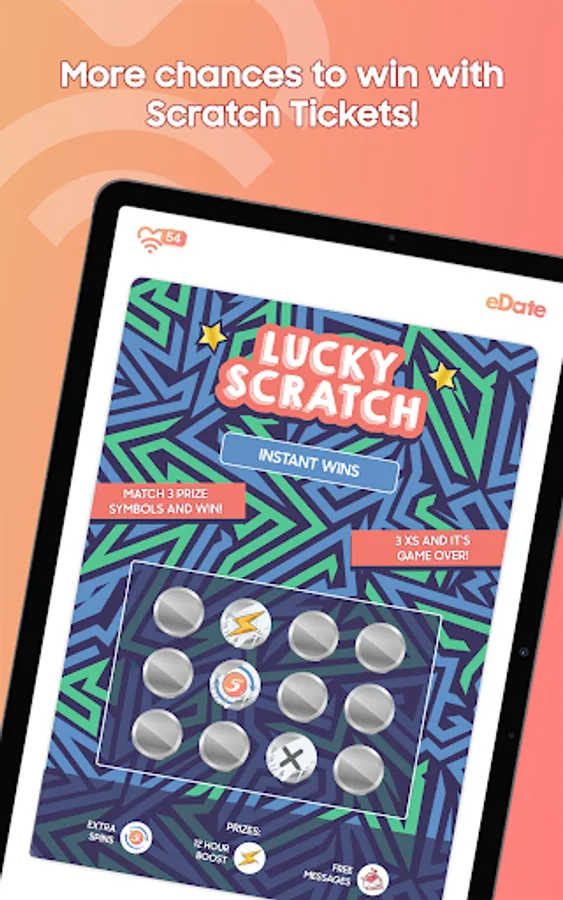 Get ready to win big with eDate! Our daily instant wins give you the chance to score free profile boosts, messages, x-ray vision, and more. With multiple chances to win every time you spin, you could be just a few clicks away from unlocking all the features and perks you need to find that special someone. And who knows? Your perfect match could be waiting for you right now, so why not take a spin and see where eDate takes you?
