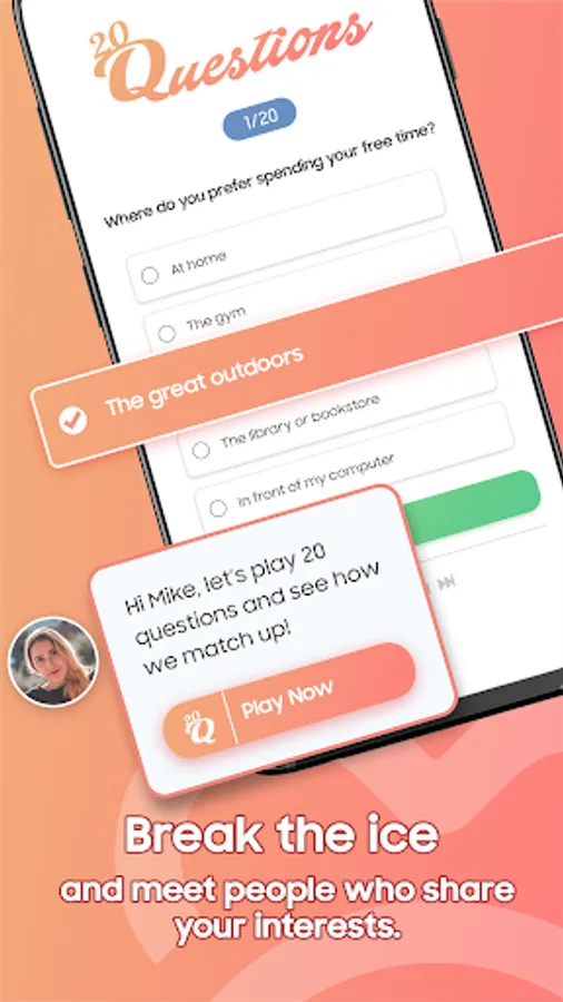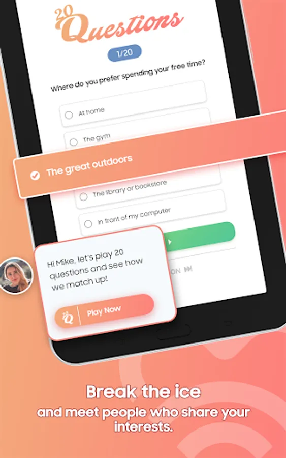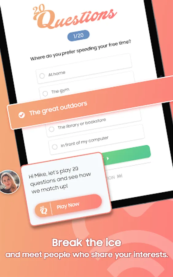 Make your profile shine by playing 20 questions. Interested in someone and want to know what they are into? Break the ice and ask them to play a round.