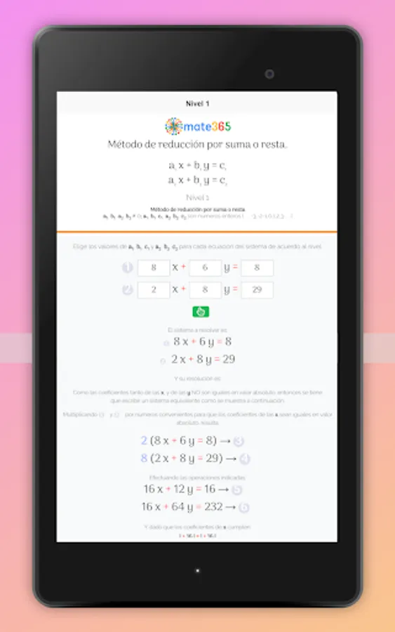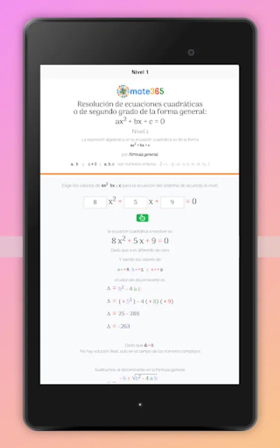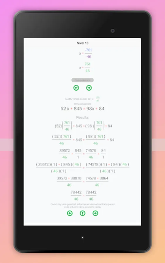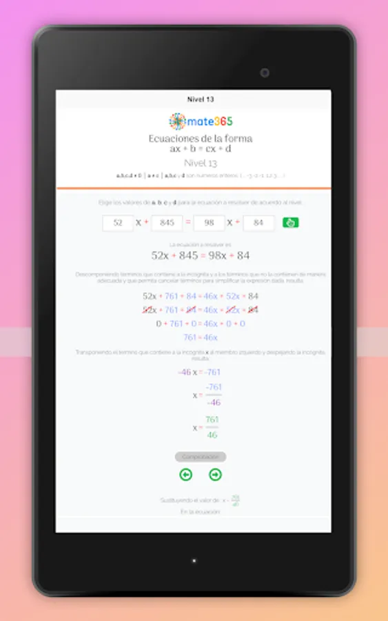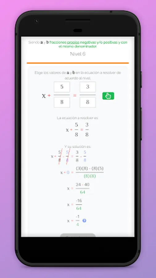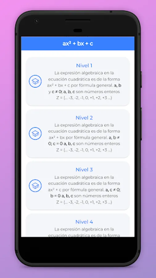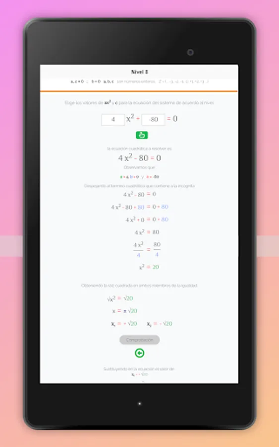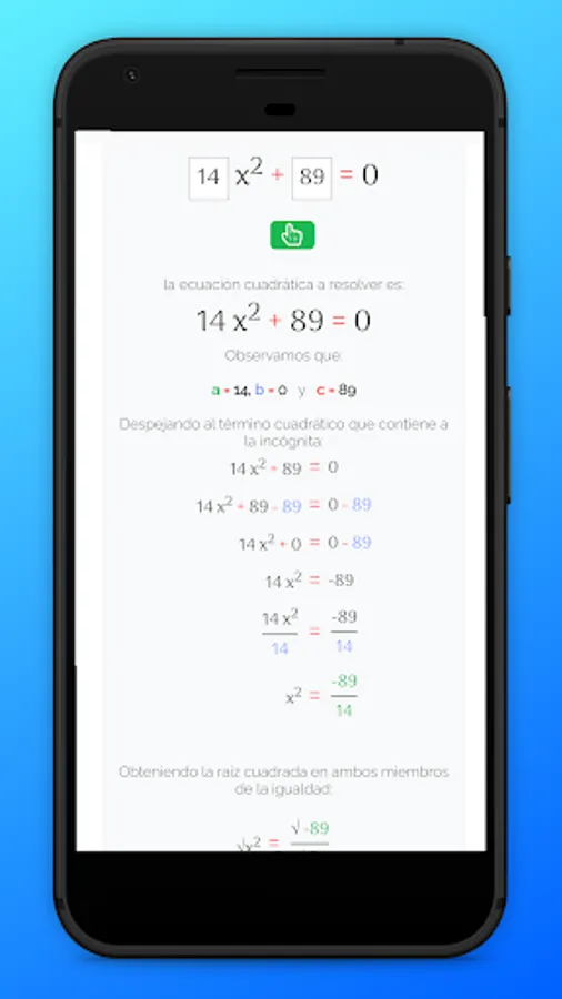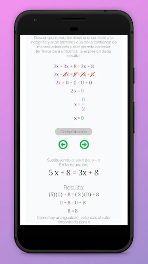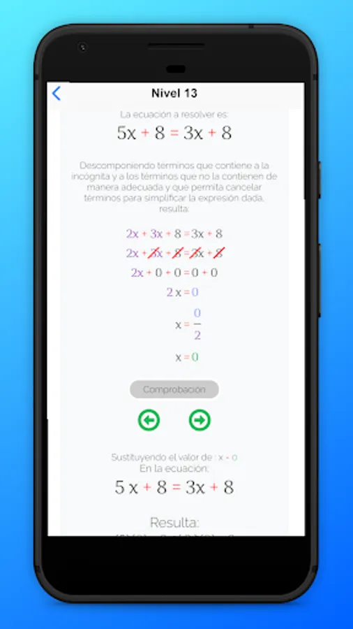 In this application you will learn to learn to solve linear and quadratic equations. We develop step by step the solution process of each equation. We start with natural numbers, raising the level of learning to whole numbers and concluding with fractional numbers. You can follow the development of the solution of the equation that you want to solve to learn the procedure, solve an equation in your notebook and compare the result in the application, so you will know if you did it correctly or what you were missing. In this way, you will master the procedure preparing you to solve more complex equations.