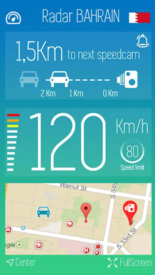 Radar BAHRAIN displays the positioning of speed cameras in BAHRAIN, as well as your position on the map and the speed you are driving at.