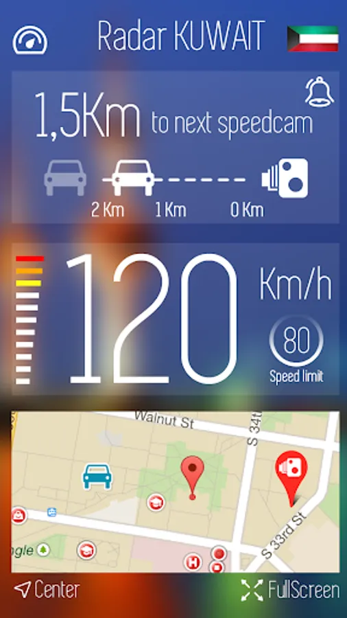 Radar KUWAIT displays the positioning of speed cameras in KUWAIT, as well as your position on the map and the speed you are driving at.