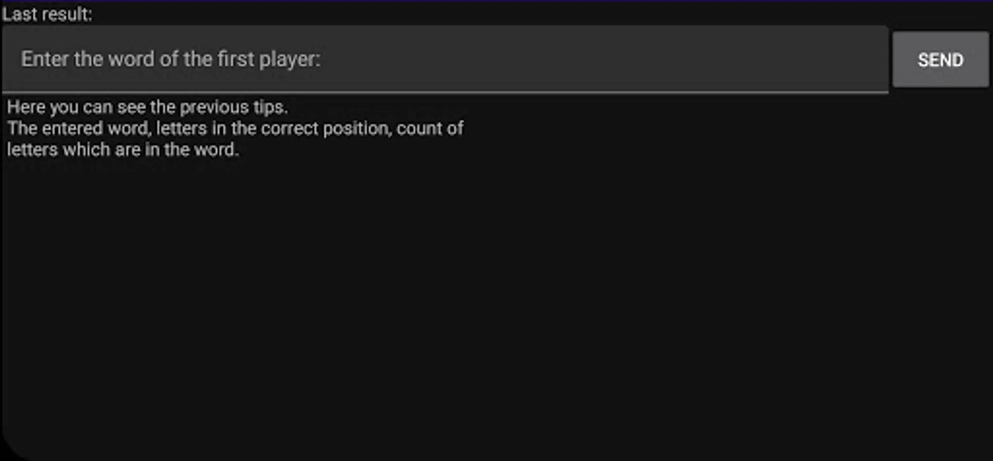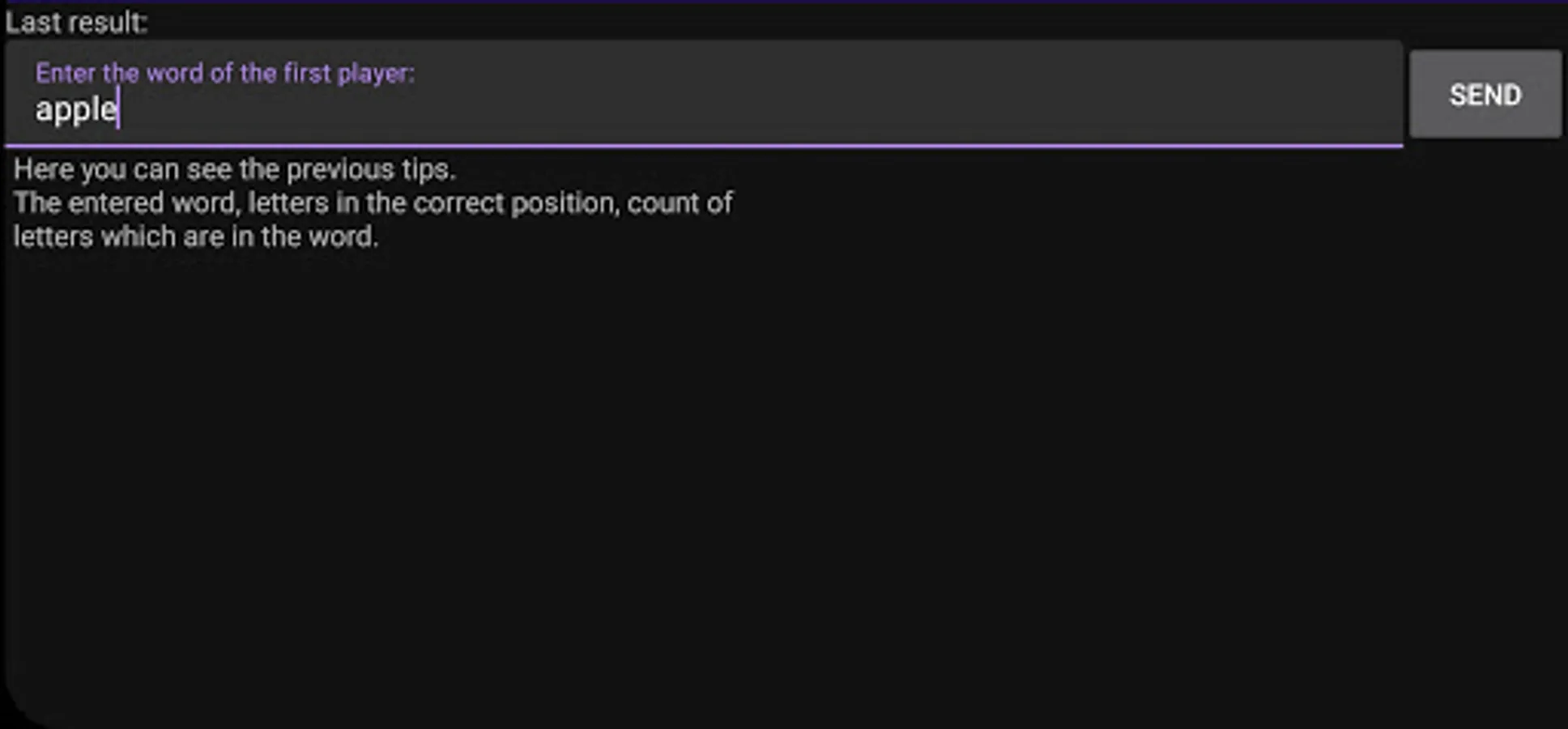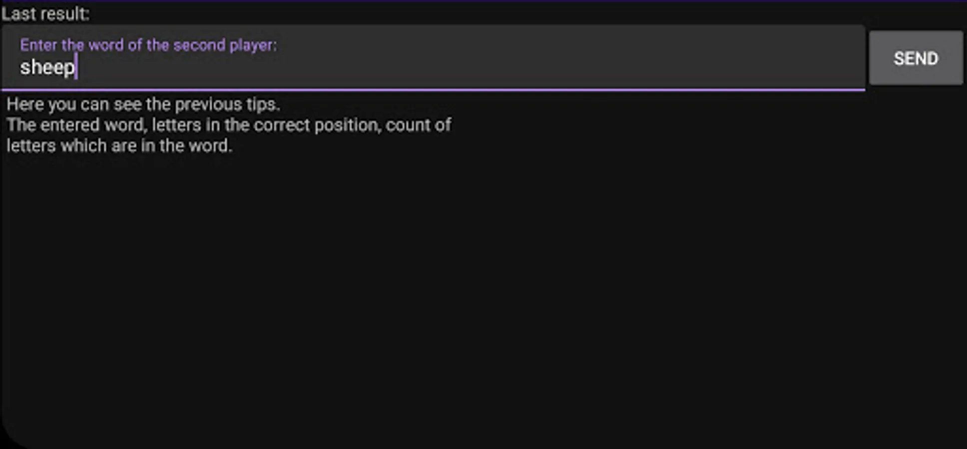 For example if the secret word is "APPLE" and the guess is "SHEEP", the result is that the secret word contains 2 letters from the tip, and none of them are in the correct position.