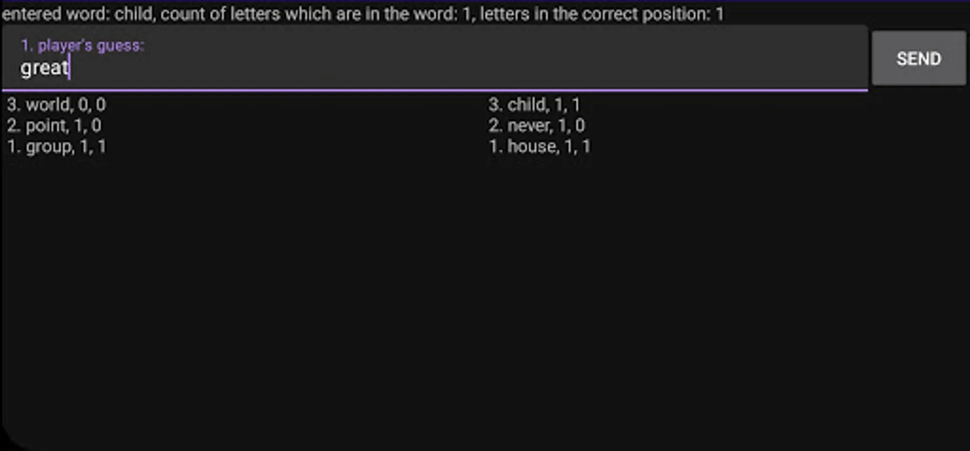 After each guess players are told how many letters does the other player's word contain from their tip, and how many are in the correct position.