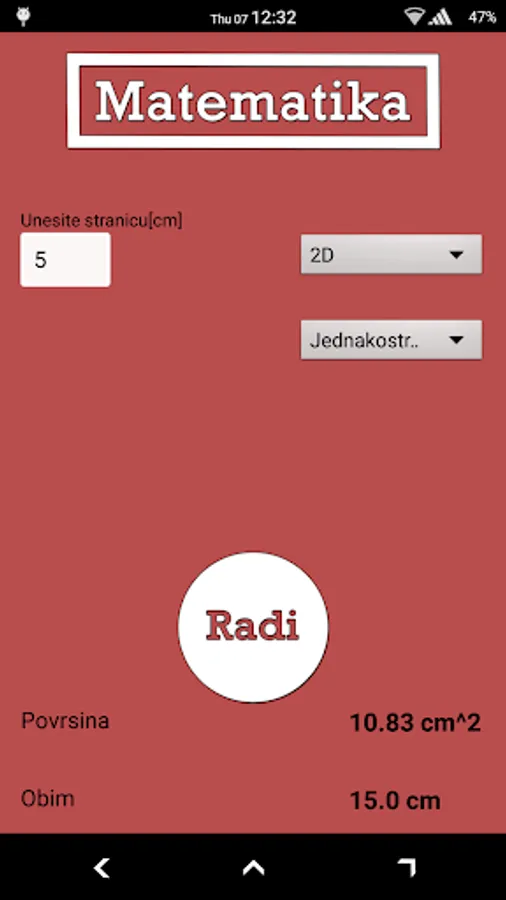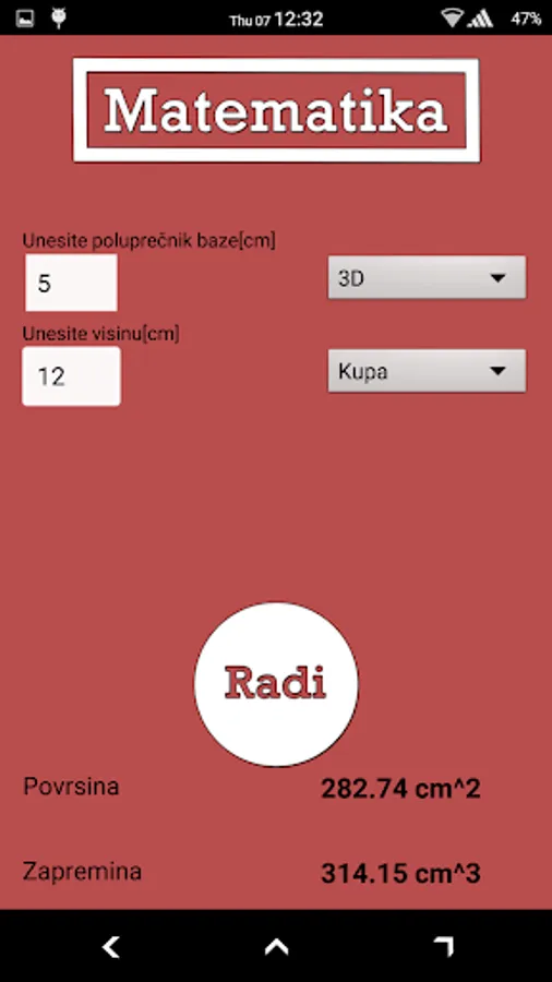 Ova aplikacija je napravljena da bi računala površinu i obim za 2D tela i površinu i zapreminu za 3D tela.