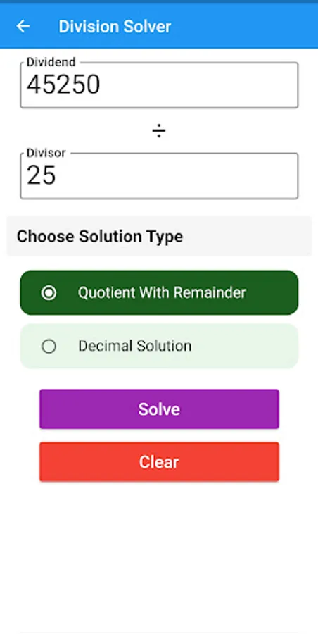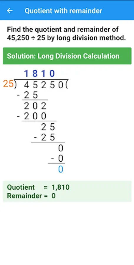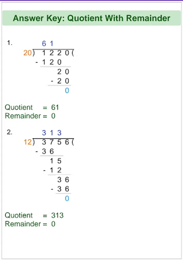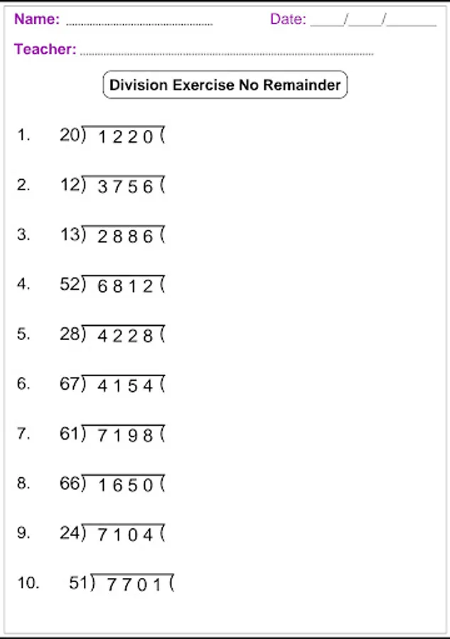 This app solve division in long method or column method. This app also designed to generate division worksheets in printable pdf. This app is capable to generate pdf worksheets with answer keys.