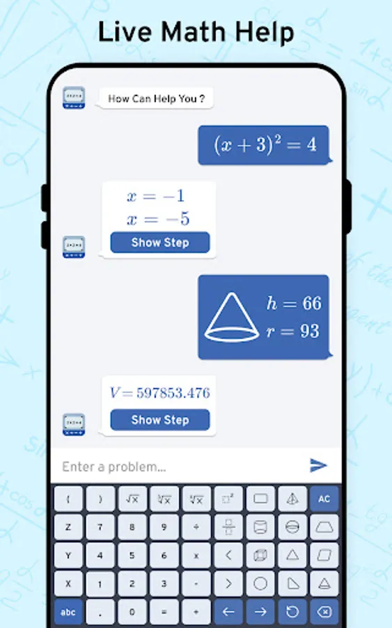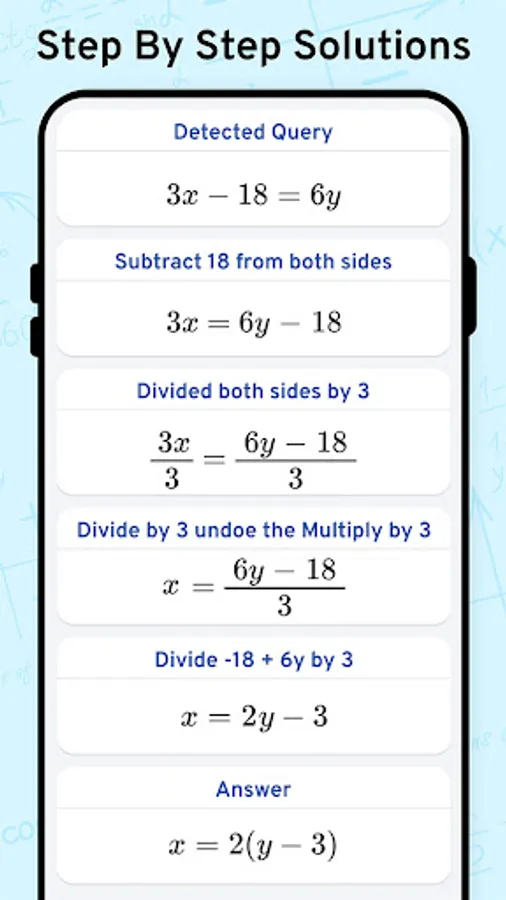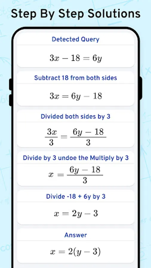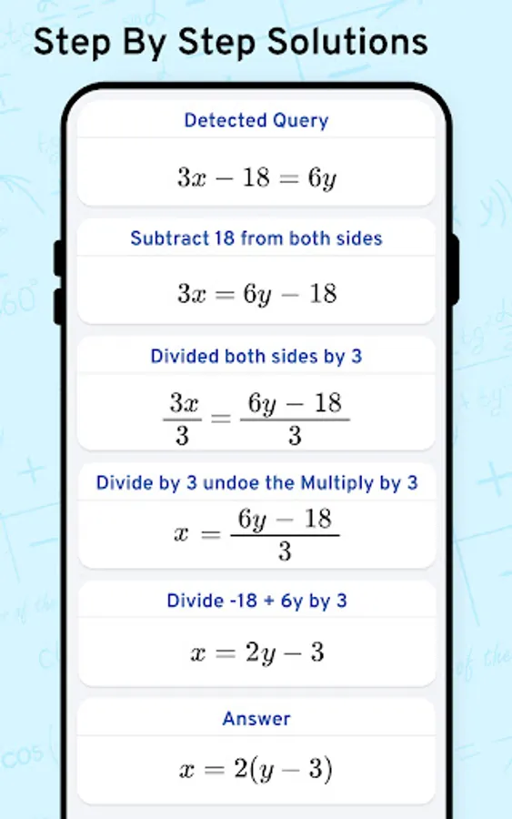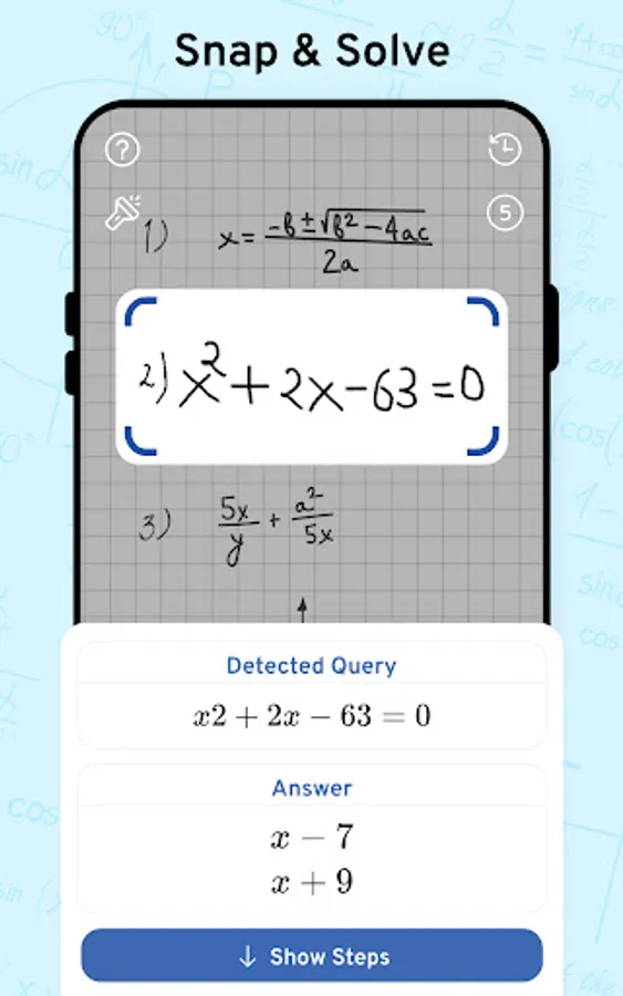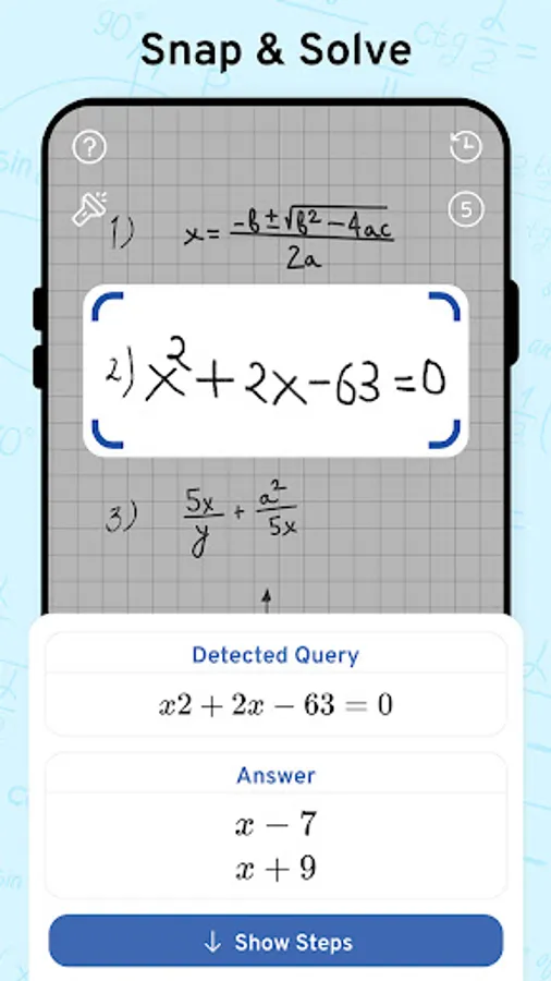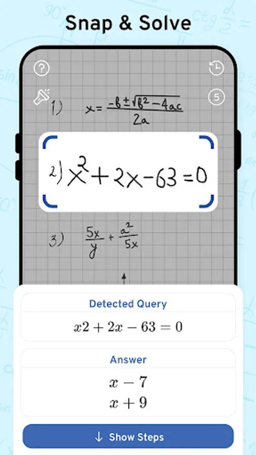 Math Scanner by Photo - Solve My Math Problem Maths will give you the answer to any math question by simply taking a photo of it. With millions of users and many problems solved, math way is the world's smartest math calculator app. With a smart calculator, you just need to enter the formula and the equation calculator will give you answers automatically. Simply point your camera toward a problem and photo calculator will magically show the result with detailed step-by-step instructions. The calculator will give you the answer to any math question by simply taking a photo of it. The calculator is a great way to check your homework, study and learn math. Supports arithmetic, integers, fractions, decimal numbers, roots, algebraic expressions, linear equations/inequalities, quadratic equations/inequalities, absolute equations/inequalities, systems of equations, logarithms, trigonometry, exponential and logarithmic functions, derivatives and integrals, graphs and many more.