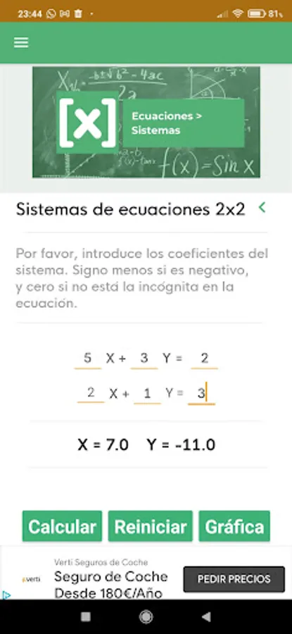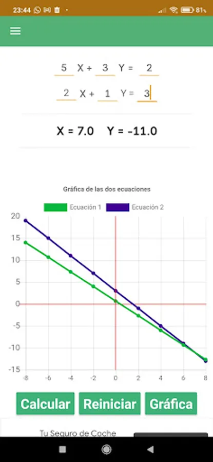 1.- System of 2 equations with 2 unknowns (2x2). Once calculated the solutions you will be able to see its solution graphically, representing them graphically.