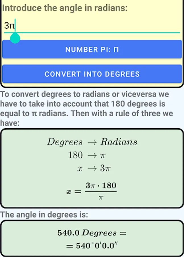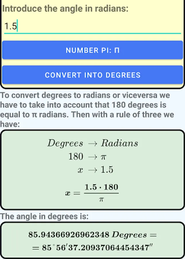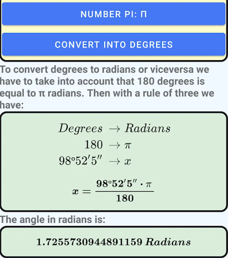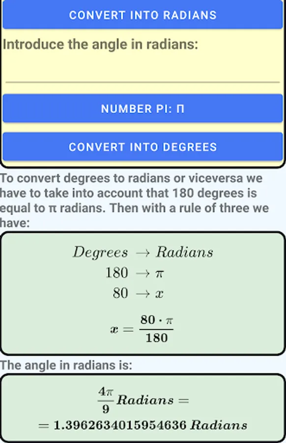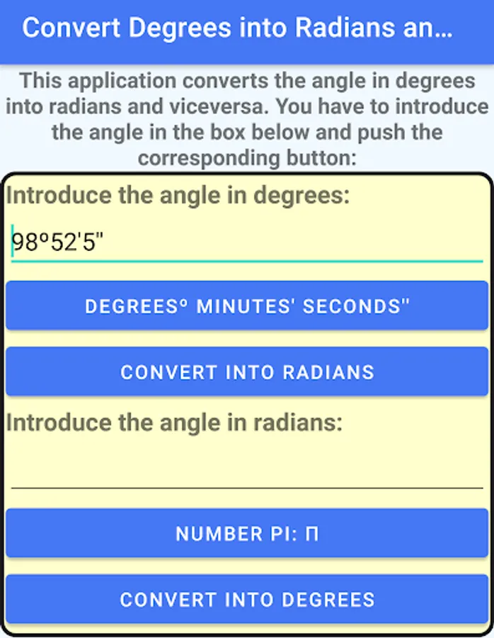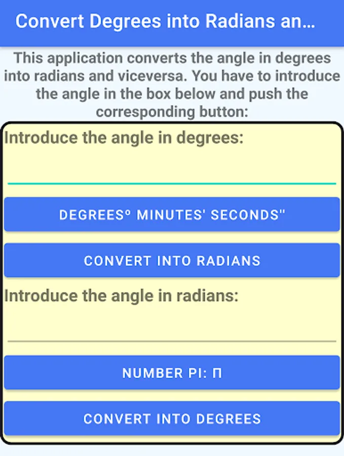 This application converts an angle in degrees to its equivalent in radians and viceversa.