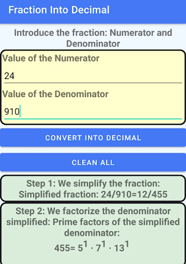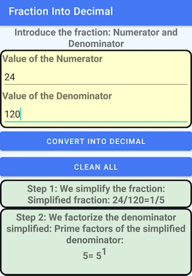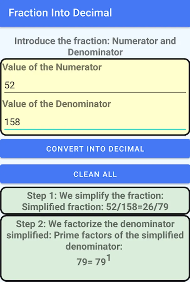 To sum up, the user has to introduce the numerator and the denominator of the fraction and the app follows the following steps: