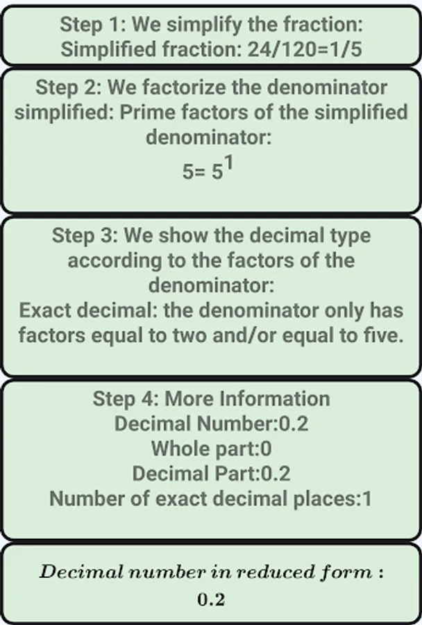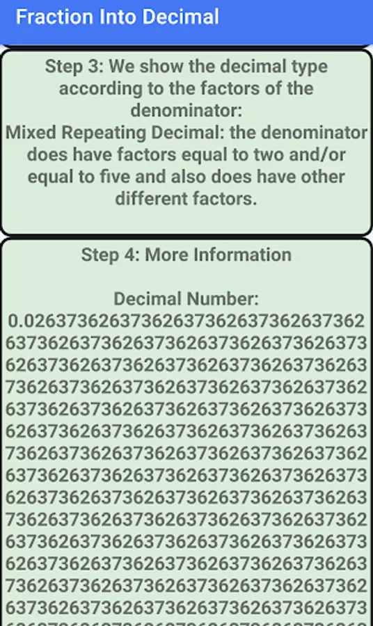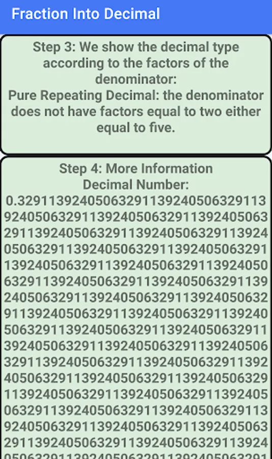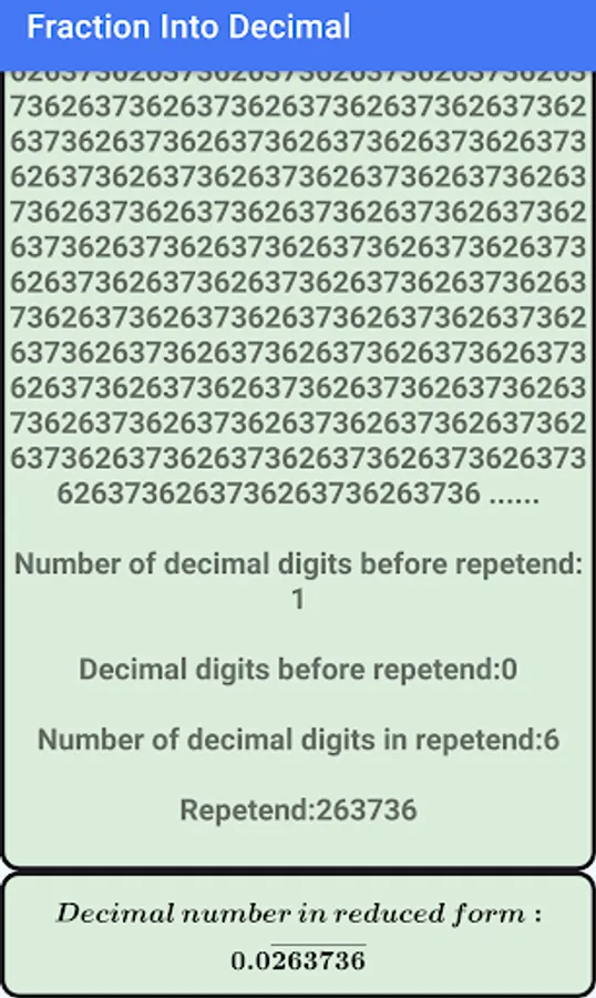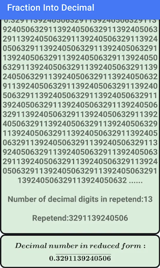 The app also shows the type of decimal: exact decimal, pure repeating decimal or mixed repeating decimal.