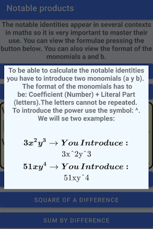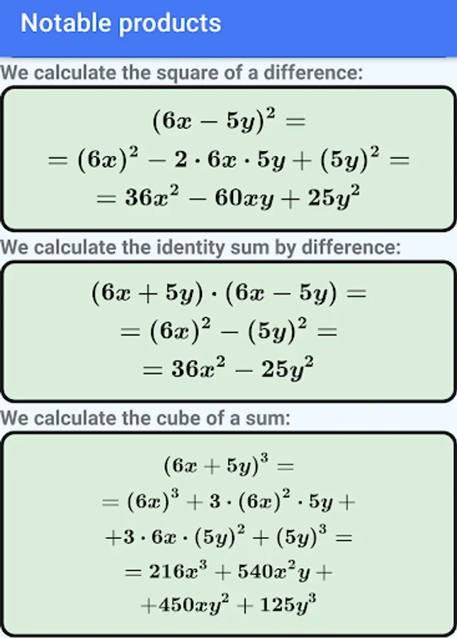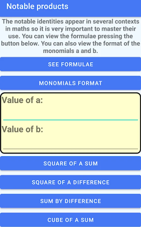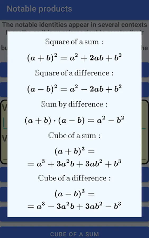The application shows the develpment of the notable identities, doing the operations step by step. The user can also see the formulae of the notable identities.