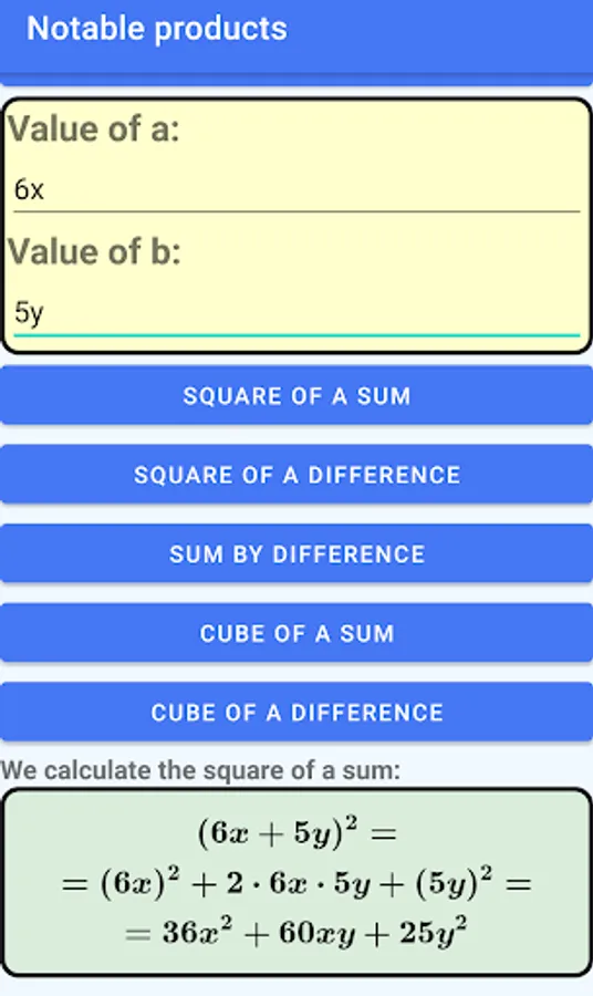The user can calculate the development of the most important notable identities: square of a sum, square of a difference, sum by difference,