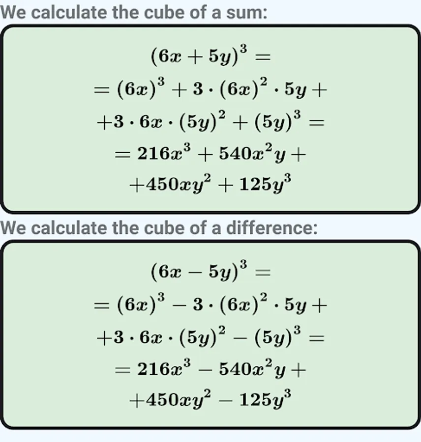 cube of a sum and cube os a difference. To do this you have to introduce two monomials (a and b) and then you can see the development of the