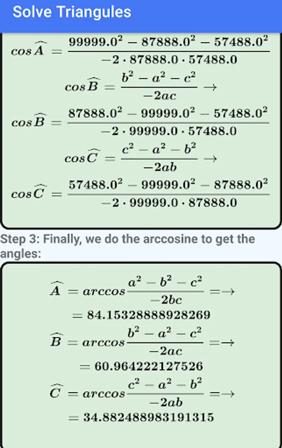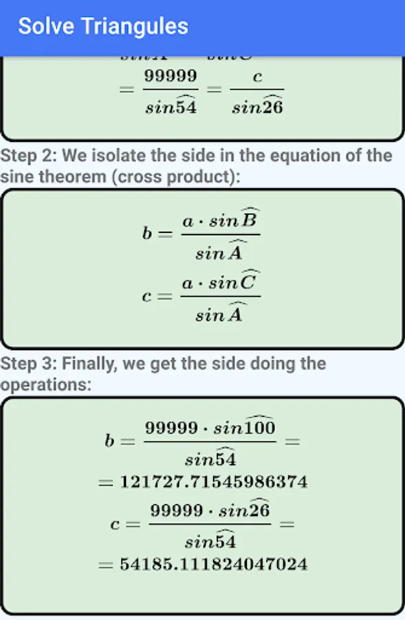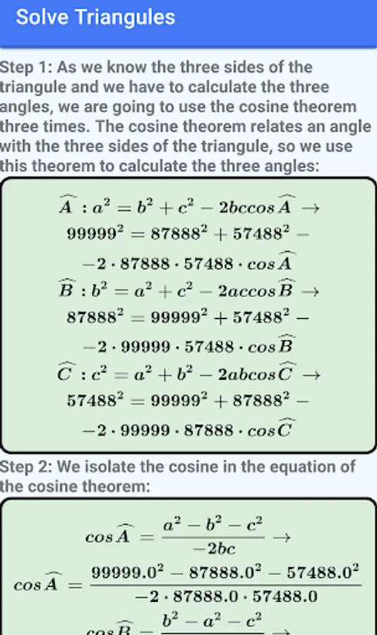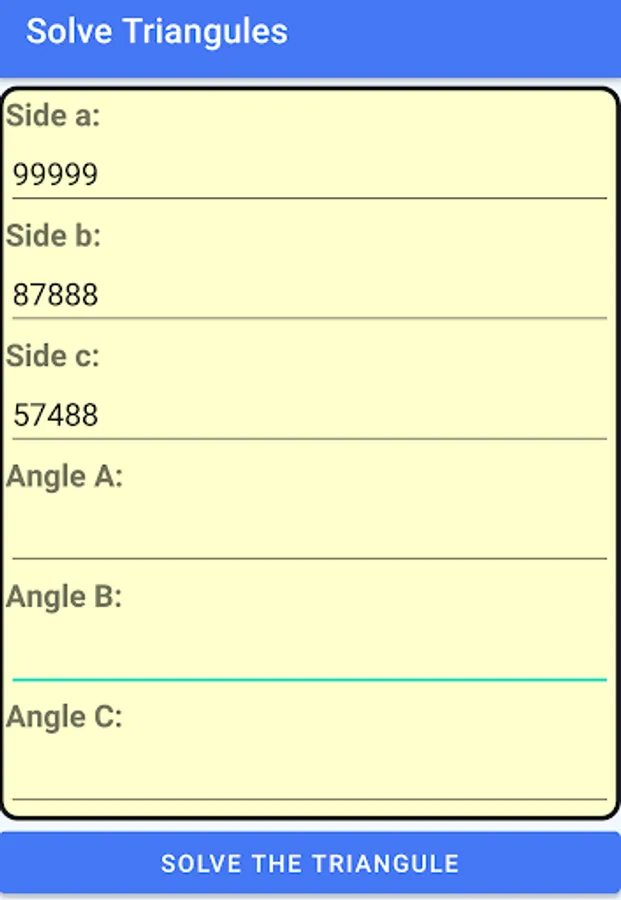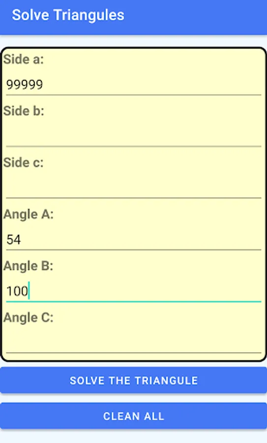 Therefore, firstly the user has to introduce three values (one of them has to be a side). The app will use the cosine theorem and the sine theorem (and the sum of the 3 angles of the triangule is 180 degrees) to calculate the other three values.