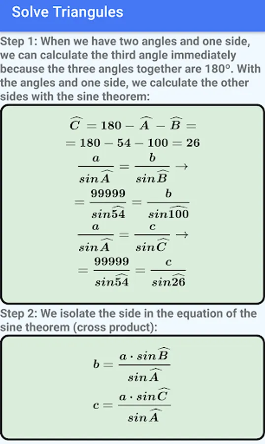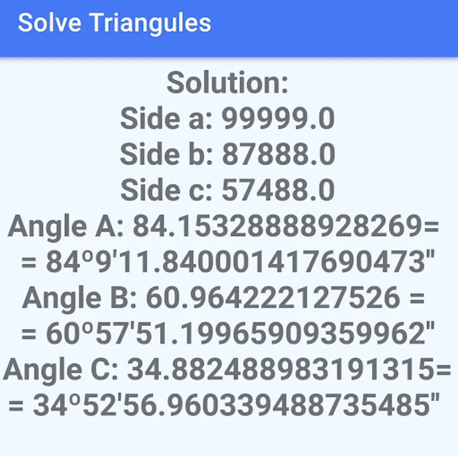 With this app the user can solve any triangule. A triangule has 3 sides and 3 angles. Solving the triangule consists of introducing three values of the triangule and getting the other three.