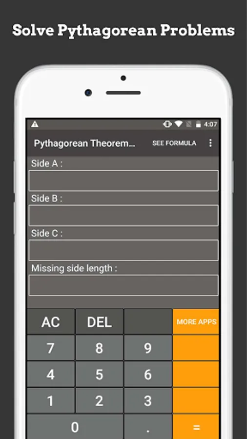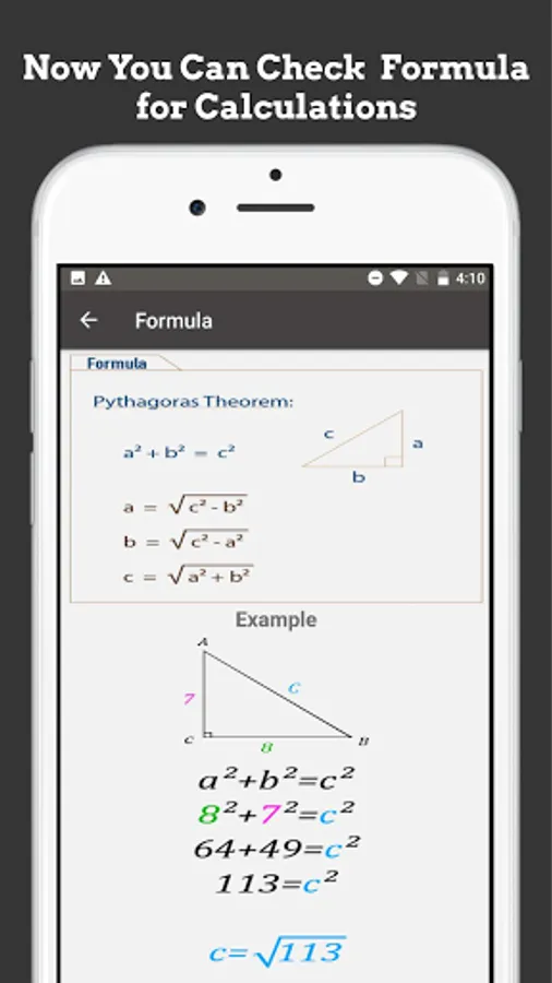 The Pythagorean Theorem states that a²+b²=c². The app will calculate the third side according to the Pythagorean Theorem.