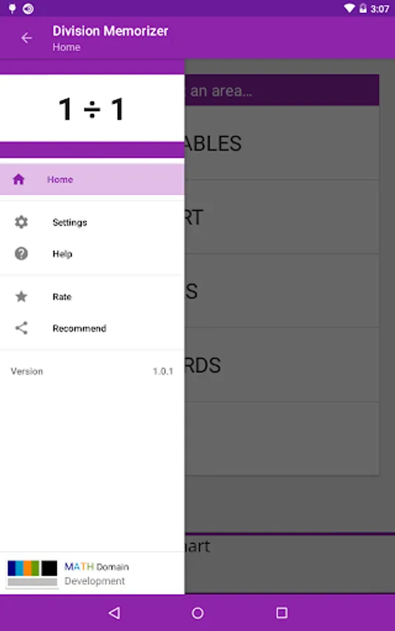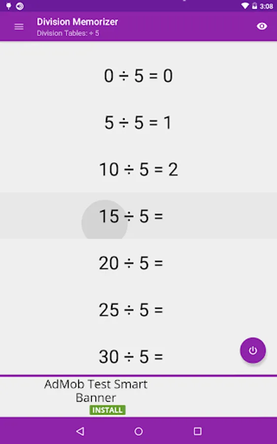 Division Tables provides a stress free learning environment. It's a modern take on division flash cards. This area displays the entire division table, a "row" at a time. You can show or hide the answers to any division problem at any time. There are no questions, no time limit, no data tracking.